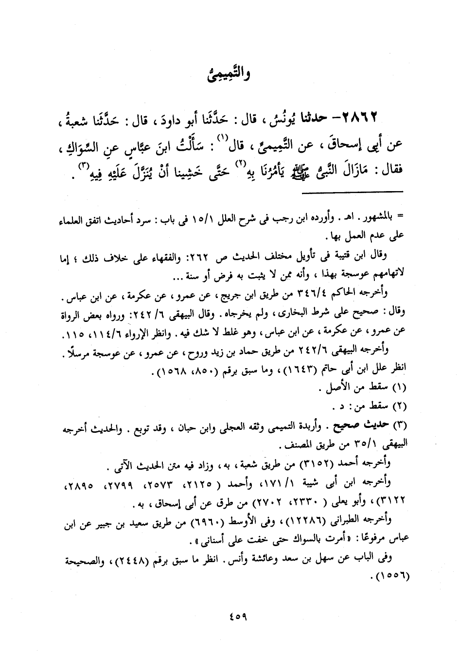 2862 - حَدَّثَنَا يُونُسُ قَالَ: حَدَّثَنَا أَبُو دَاوُدَ قَالَ: حَدَّثَنَا شُعْبَةُ، عَنْ أَبِي إِسْحَاقَ، عَنِ التَّمِيمِيِّ، قَالَ: سَأَلْتُ ابْنَ عَبَّاسٍ عَنِ السِّوَاكِ، فَقَالَ: «§مَا زَالَ النَّبِيُّ صَلَّى اللهُ عَلَيْهِ وَسَلَّمَ يَأْمُرُنَا بِهِ حَتَّى خَشِينَا أَنْ يُنَزَّلَ عَلَيْهِ فِيهِ»