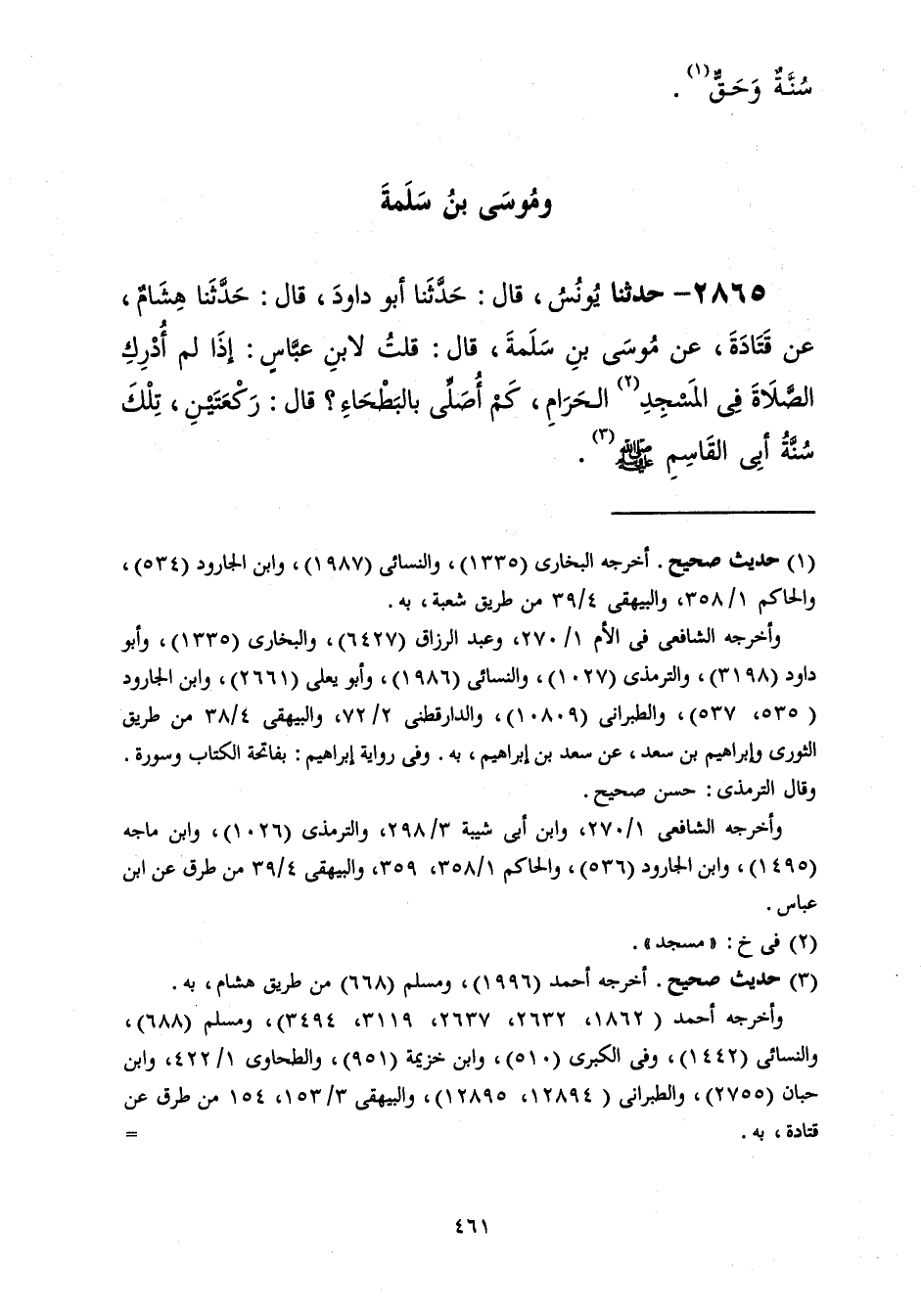 2865 - حَدَّثَنَا أَبُو دَاوُدَ قَالَ: حَدَّثَنَا هِشَامٌ، عَنْ قَتَادَةَ، عَنْ مُوسَى بْنِ سَلَمَةَ، قَالَ: قُلْتُ لِابْنِ عَبَّاسٍ: §إِذَا لَمْ أُدْرِكِ الصَّلَاةَ فِي الْمَسْجِدِ الْحَرَامِ، كَمْ أُصَلِّي بِالْبَطْحَاءِ؟ قَالَ: «رَكْعَتَيْنِ، تِلْكَ سُنَّةُ أَبِي الْقَاسِمِ صَلَّى اللهُ عَلَيْهِ وَسَلَّمَ»