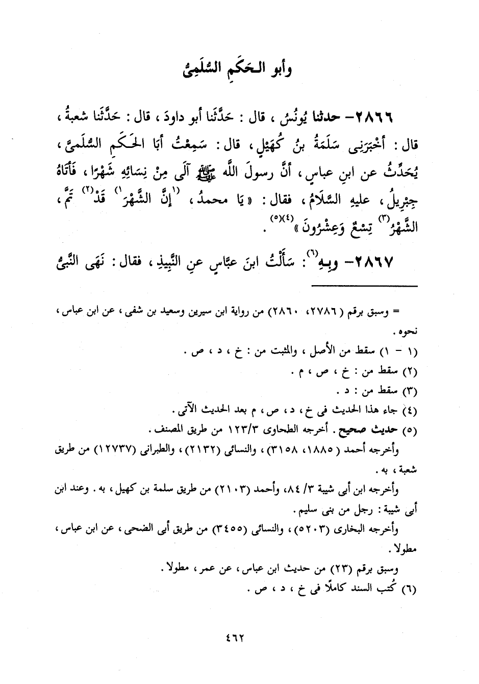 2866 - حَدَّثَنَا دَاوُدَ قَالَ: حَدَّثَنَا شُعْبَةُ، قَالَ: أَخْبَرَنِي سَلَمَةُ بْنُ كُهَيْلٍ، قَالَ: سَمِعْتُ أَبَا الْحَكَمِ السُّلَمِيَّ، يُحَدِّثُ عَنِ ابْنِ عَبَّاسٍ، أَنَّ رَسُولَ اللَّهِ صَلَّى اللهُ عَلَيْهِ وَسَلَّمَ " §آلَى مِنْ نِسَائِهِ شَهْرًا، فَأَتَاهُ جِبْرِيلُ عَلَيْهِ السَّلَامُ فَقَالَ: يَا مُحَمَّدُ، إِنَّ الشَّهْرَ قَدْ تَمَّ، الشَّهْرُ تِسْعٌ وَعِشْرُونَ "