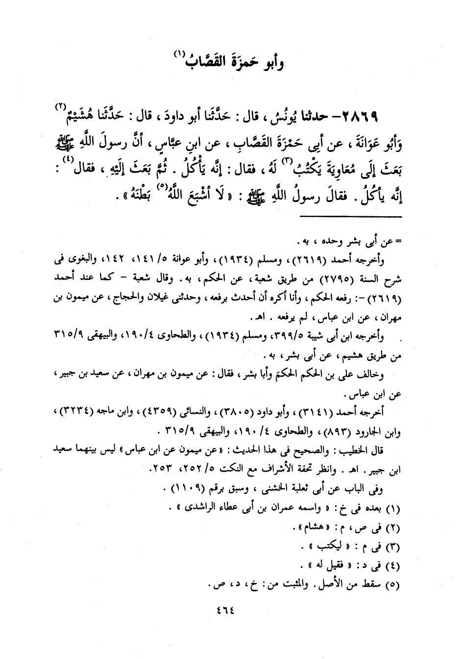 2869 - حَدَّثَنَا يُونُسُ قَالَ: حَدَّثَنَا أَبُو دَاوُدَ قَالَ: حَدَّثَنَا هِشَامٌ، وَأَبُو عَوَانَةَ، عَنْ أَبِي حَمْزَةَ الْقَصَّابِ، عَنِ ابْنِ عَبَّاسٍ، أَنَّ رَسُولَ اللَّهِ صَلَّى اللهُ عَلَيْهِ وَسَلَّمَ بَعَثَ إِلَى مُعَاوِيَةَ يَكْتُبُ لَهُ، فَقَالَ: إِنَّهُ يَأْكُلُ ثُمَّ بَعَثَ إِلَيْهِ فَقَالَ: إِنَّهُ يَأْكُلُ فَقَالَ رَسُولُ اللَّهِ صَلَّى اللهُ عَلَيْهِ وَسَلَّمَ: «§لَا أَشْبَعَ اللَّهُ بَطْنَهُ» -[465]- قَالَ عَبْدُ اللَّهِ بْنُ جَعْفَرِ بِنْ فَارِسٍ، الرَّاوِي عَنْ يُونُسَ بْنِ حَبِيبٍ، مَعْنَاهُ وَاللَّهُ أَعْلَمُ: لَا أَشْبَعَ اللَّهُ بَطْنَهُ فِي الدُّنْيَا حَتَّى لَا يَكُونَ مِمَّنْ يَجُوعُ يَوْمَ الْقِيَامَةِ؛ لِأَنَّ الْخَبَرَ عَنِ النَّبِيِّ صَلَّى اللهُ عَلَيْهِ وَسَلَّمَ أَنَّهُ قَالَ: «أَطْوَلُ النَّاسِ شِبَعًا فِي الدُّنْيَا أَطْوَلُهُمْ جُوعًا يَوْمَ الْقِيَامَةِ»