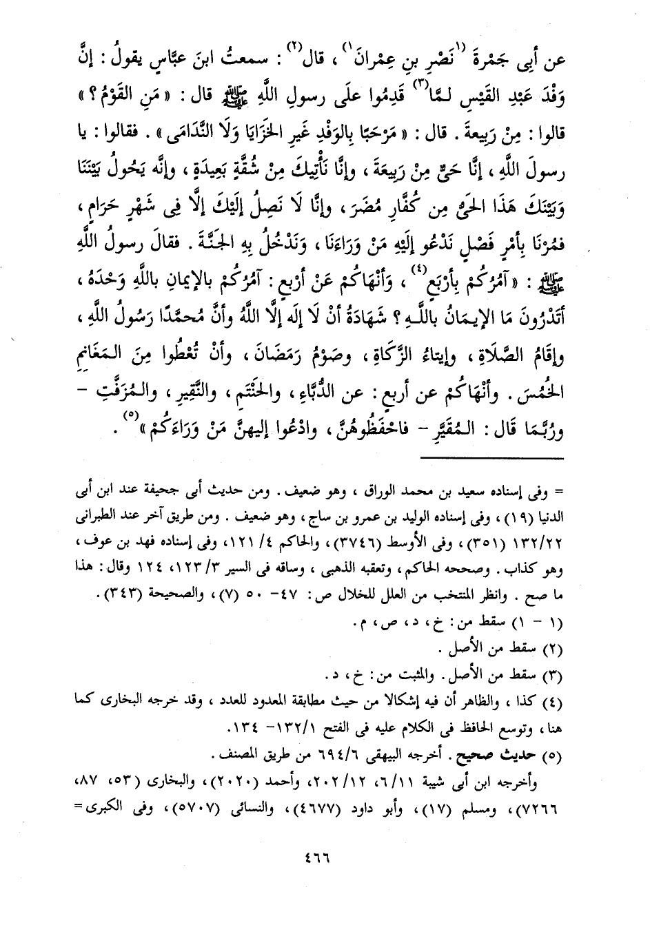 فَمُرْنَا بِأَمْرٍ فَصْلٍ نَدْعُو إِلَيْهِ مَنْ وَرَاءَنَا وَنَدْخُلُ بِهِ الْجَنَّةَ، فَقَالَ رَسُولُ اللهِ صَلَّى الله عَلَيْهِ وَسَلَّمَ: آمُرُكُمْ بِأَرْبَعٍ، وَأَنْهَاكُمْ عَنْ أَرْبَعٍ، آمُرُكُمْ بِالإِيمَانِ بِاللهِ وَحْدَهُ، أَتَدْرُونَ مَا الإِيمَانُ بِاللهِ؟ شَهَادَةُ أَنْ لاَ إِلَهَ إِلاَّ اللهُ، وَأَنَّ مُحَمَّدًا رَسُولُ اللهِ، وَإِقَامُ الصَّلاَةِ، وَإِيتَاءُ الزَّكَاةِ، وَصَوْمُ رَمَضَانَ، وَأَنْ تُعْطُوا مِنَ الْمَغَانِمِ الْخُمُسَ، وَأَنْهَاكُمْ عَنْ أَرْبَعٍ: عَنِ الدُّبَّاءِ، وَالْحَنْتَمِ، وَالنَّقِيرِ، وَالْمُزَفَّتِ، وَرُبَّمَا قَالَ: الْمُقَيَّرِ، فَاحْفَظُوهُنَّ، وَادْعُوا إِلَيْهِنَّ مَنْ وَرَاءَكُمْ.
