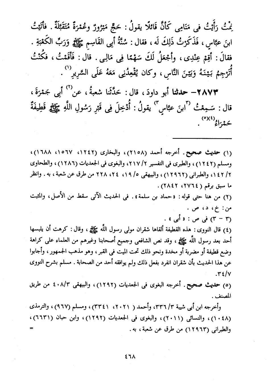 2873 - حَدَّثَنَا أَبُو دَاوُدَ قَالَ: حَدَّثَنَا شُعْبَةُ، عَنْ أَبِي جَمْرَةَ، قَالَ: سَمِعْتُ ابْنَ عَبَّاسٍ، يَقُولُ: «§أُدْخِلَ فِي قَبْرِ رَسُولِ اللَّهِ صَلَّى اللهُ عَلَيْهِ وَسَلَّمَ قَطِيفَةٌ حَمْرَاءُ»