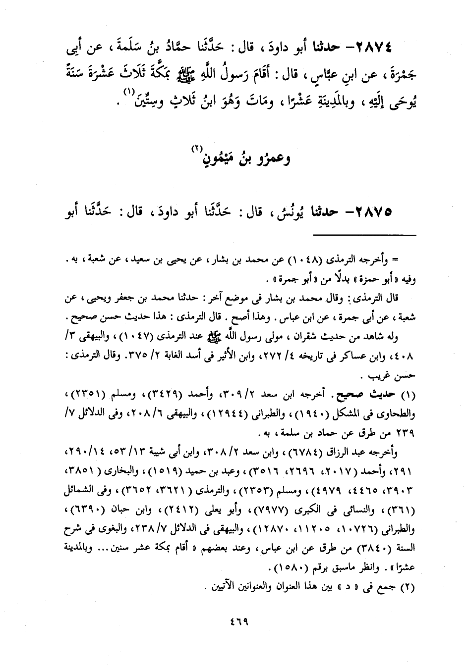 2874 - حَدَّثَنَا أَبُو دَاوُدَ قَالَ: حَدَّثَنَا حَمَّادُ بْنُ سَلَمَةَ، عَنْ أَبِي جَمْرَةَ، عَنِ ابْنِ عَبَّاسٍ، قَالَ: «§أَقَامَ رَسُولُ اللَّهِ صَلَّى اللهُ عَلَيْهِ وَسَلَّمَ بِمَكَّةَ ثَلَاثَ عَشْرَةَ سَنَةً يُوحَى إِلَيْهِ، وَبِالْمَدِينَةِ عَشْرًا، وَمَاتَ وَهُوَ ابْنُ ثَلَاثٍ وَسِتِّينَ»