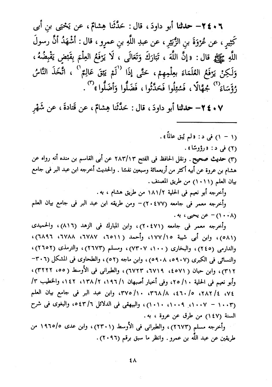 2406 - حَدَّثَنَا أَبُو دَاوُدَ قَالَ: حَدَّثَنَا هِشَامٌ، عَنْ يَحْيَى بْنِ أَبِي كَثِيرٍ، عَنْ عُرْوَةَ بْنِ الزُّبَيْرِ، عَنْ عَبْدِ اللَّهِ بْنِ عَمْرٍو، قَالَ: أَشْهَدُ أَنَّ رَسُولَ اللَّهِ صَلَّى اللهُ عَلَيْهِ وَسَلَّمَ قَالَ: «إِنَّ اللَّهَ تَبَارَكَ وَتَعَالَى §لَا يَرْفَعُ الْعِلْمَ بِقَبْضٍ يَقْبِضُهُ، وَلَكِنْ يَرْفَعُ الْعُلَمَاءَ بِعِلْمِهِمْ، حَتَّى إِذَا لَمْ يَبْقَ عَالِمٌ اتَّخَذَ النَّاسُ رُؤَسَاءَ جُهَّالًا، فَسُئِلُوا فَحَدِّثُوا، فَضَلُّوا وَأَضَلُّوا»