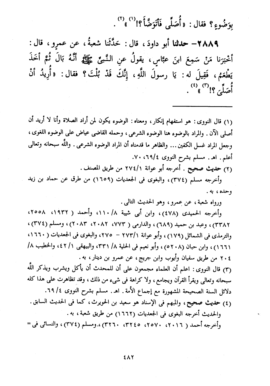 2889 - حَدَّثَنَا أَبُو دَاوُدَ قَالَ: حَدَّثَنَا شُعْبَةُ، عَنْ عَمْرٍو، قَالَ: أَخْبَرَنَا مَنْ، سَمِعَ ابْنَ عَبَّاسٍ، يَقُولُ: عَنِ النَّبِيِّ صَلَّى اللهُ عَلَيْهِ وَسَلَّمَ أَنَّهُ §بَالَ ثُمَّ أَخَذَ يَطْعَمُ، فَقِيلَ لَهُ: يَا رَسُولَ اللَّهِ، إِنَّكَ قَدْ بُلْتَ، فَقَالَ: «أُرِيدُ أَنْ أُصَلِّيَ؟»