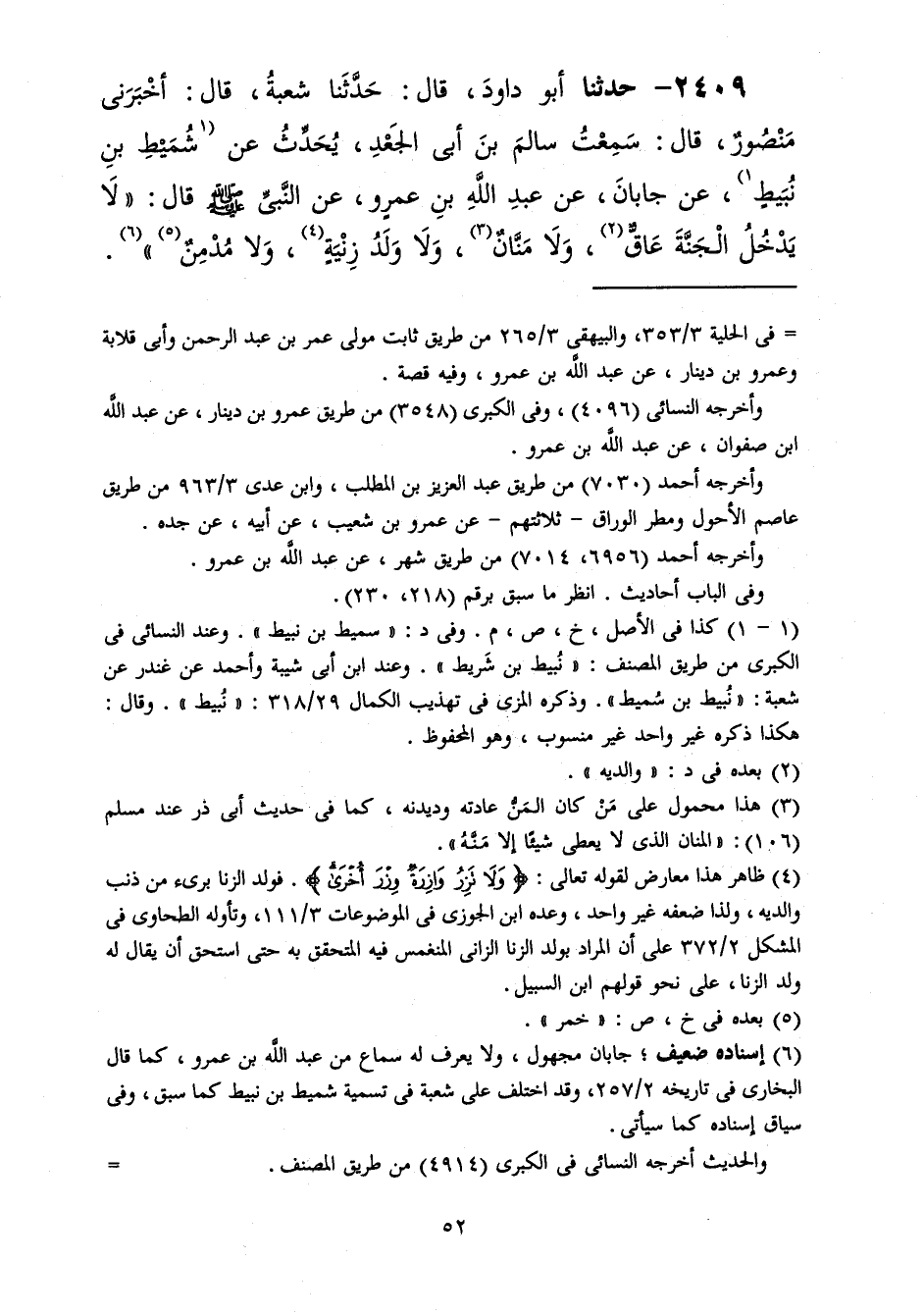 2409 - حَدَّثَنَا أَبُو دَاوُدَ قَالَ: حَدَّثَنَا شُعْبَةُ، قَالَ: أَخْبَرَنِي مَنْصُورٌ، قَالَ: سَمِعْتُ سَالِمَ بْنَ أَبِي الْجَعْدِ، يُحَدِّثُ عَنْ شُمَيْطِ بْنِ نُبَيْطٍ، عَنْ جَابَانَ، عَنْ عَبْدِ اللَّهِ بْنِ عَمْرٍو، عَنِ النَّبِيِّ صَلَّى اللهُ عَلَيْهِ وَسَلَّمَ قَالَ: «§لَا يَدْخُلُ الْجَنَّةَ، عَاقٌّ وَلَا مَنَّانٌ، وَلَا وَلَدُ زِنْيَةٍ، وَلَا مُدْمِنٌ»