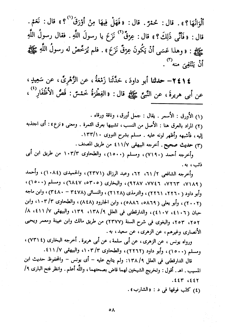 2413 - حَدَّثَنَا أَبُو دَاوُدَ قَالَ: حَدَّثَنَا ابْنُ أَبِي ذِئْبٍ، عَنِ الزُّهْرِيِّ، عَنْ سَعِيدٍ، عَنْ أَبِي هُرَيْرَةَ، أَنَّ رَجُلًا صَرَخَ بِرَسُولِ اللَّهِ صَلَّى اللهُ عَلَيْهِ وَسَلَّمَ مِنْ بَنِي فَزَارَةَ فَقَالَ: يَا رَسُولَ اللَّهِ، إِنَّ امْرَأَتِي وَلَدَتْ لِي غُلَامًا أَسْوَدَ، فَأَنَّى ذَاكَ يَا رَسُولَ اللَّهِ؟، قَالَ: «هَلْ لَكَ مِنْ إِبِلٍ؟» قَالَ: نَعَمْ قَالَ: «فَمَا -[59]- أَلْوَانُهَا؟» قَالَ: حُمْرٌ قَالَ: «فَهَلْ فِيهَا مِنْ أَوْرَقَ؟» قَالَ: نَعَمْ، قَالَ: «فَأَنَّى ذَلِكَ؟» قَالَ: عِرْقٌ نَزَعَ يَا رَسُولَ اللَّهِ، فَقَالَ رَسُولُ اللَّهِ صَلَّى اللهُ عَلَيْهِ وَسَلَّمَ: «وَهَذَا §عَسَى أَنْ يَكُونَ عِرْقٌ نَزَعَ» فَلَمْ يُرَخِّصْ لَهُ رَسُولُ اللَّهِ صَلَّى اللهُ عَلَيْهِ وَسَلَّمَ أَنْ يَنْتَفِيَ مِنْهُ