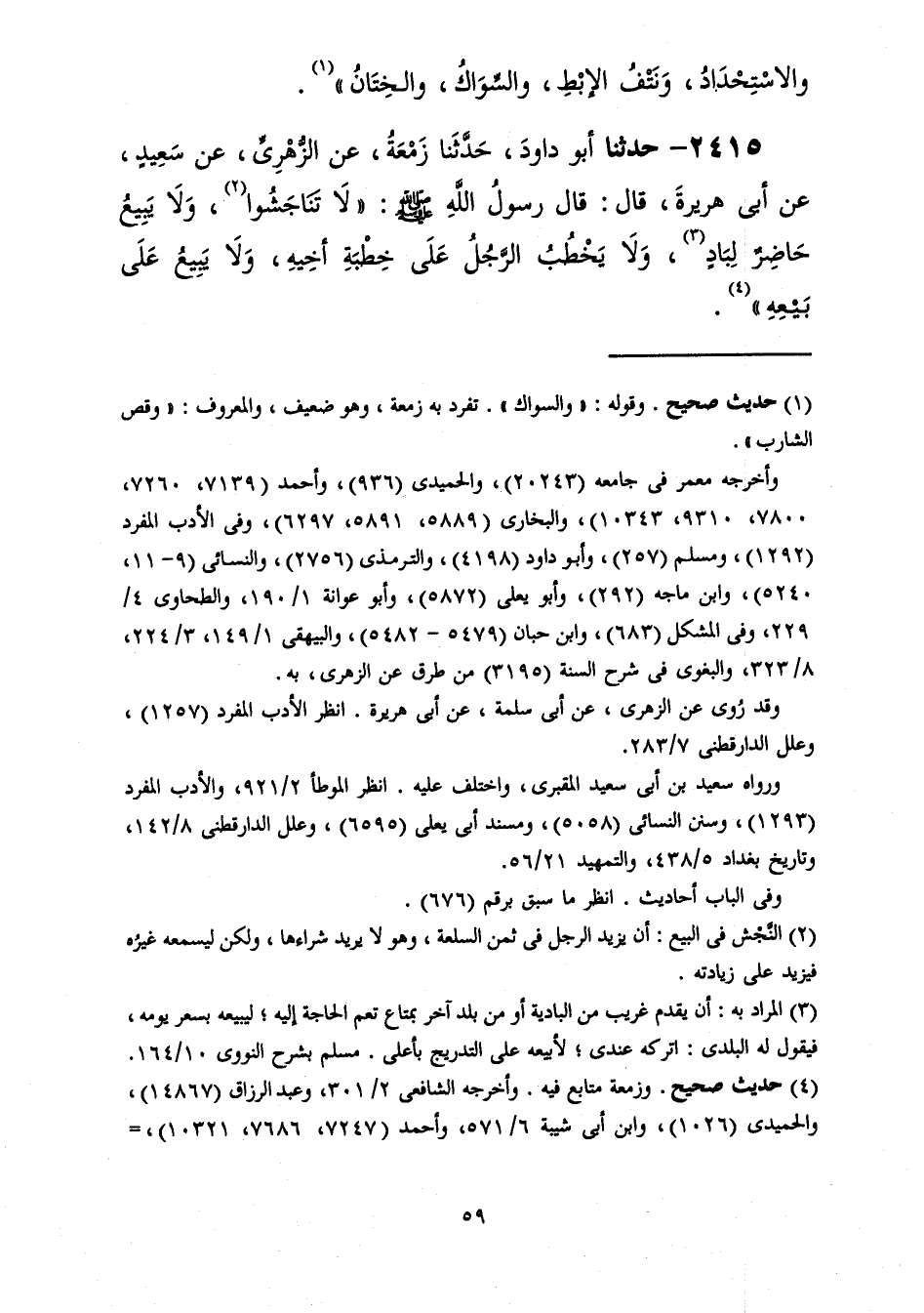 2414 - حَدَّثَنَا زَمْعَةُ، عَنِ الزُّهْرِيِّ، عَنْ سَعِيدٍ، عَنْ أَبِي هُرَيْرَةَ، عَنِ النَّبِيِّ صَلَّى اللهُ عَلَيْهِ وَسَلَّمَ قَالَ: " §الْفِطْرَةُ خَمْسٌ: قَصُّ الْأَظْفَارِ -[60]-، وَالِاسْتِحْدَادُ، وَنَتْفُ الْإِبِطِ، وَالسِّوَاكُ، وَالْخِتَانُ "