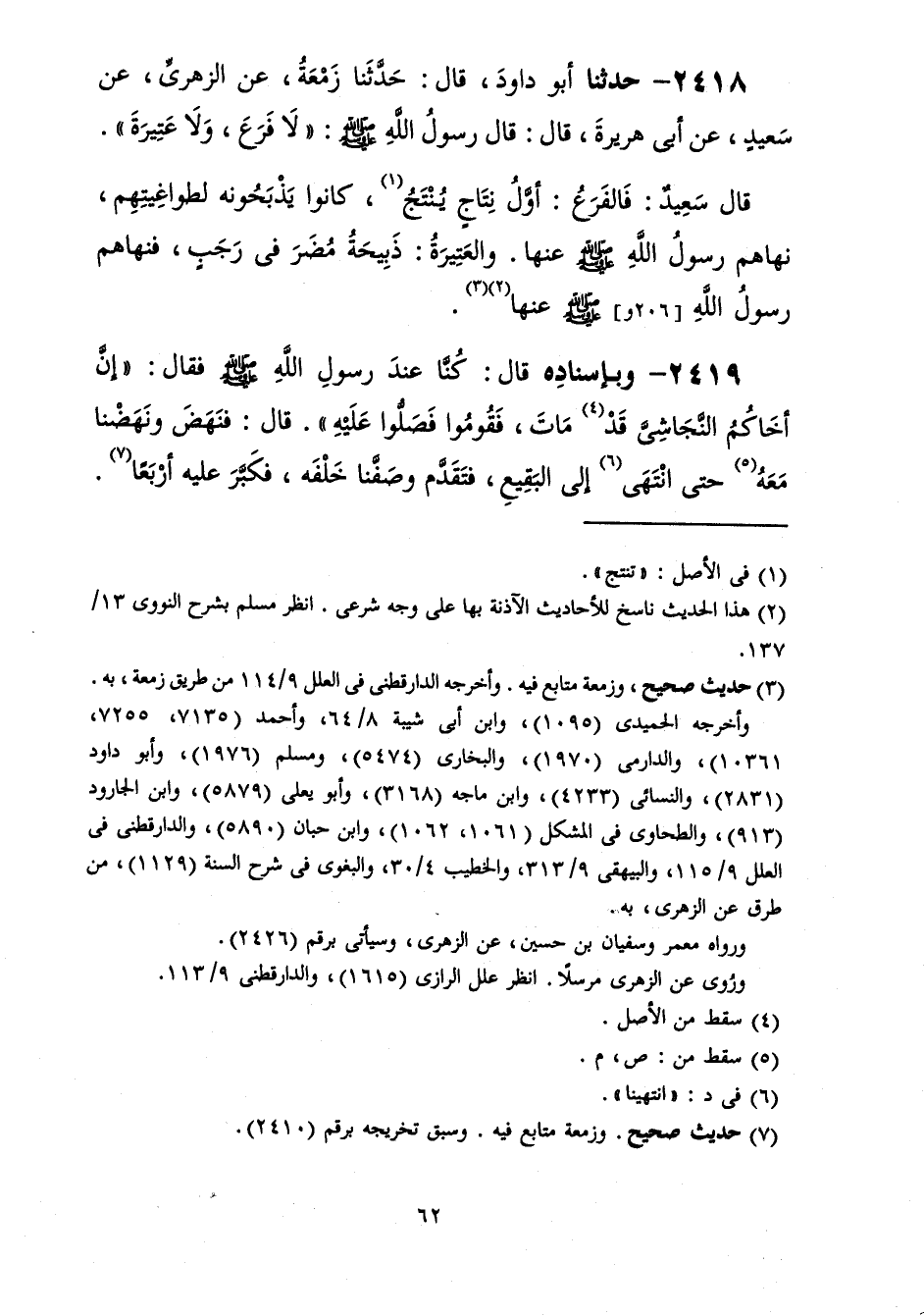 2417 - حَدَّثَنَا أَبُو دَاوُدَ قَالَ: حَدَّثَنَا زَمْعَةُ، عَنِ الزُّهْرِيِّ، عَنْ سَعِيدٍ، عَنْ أَبِي هُرَيْرَةَ، قَالَ: قَالَ رَسُولُ اللَّهِ صَلَّى اللهُ عَلَيْهِ وَسَلَّمَ: «§حَقُّ الْمُسْلِمِ عَلَى أَخِيهِ الْمُسْلِمِ خَمْسٌ، رَدُّ السَّلَامِ، وَعِيَادَةُ الْمَرِيضِ، وَاتِّبَاعُ الْجِنَازَةِ، وَإِجَابَةُ الدَّاعِي، وَتَشْمِيتُ الْعَاطِسِ»