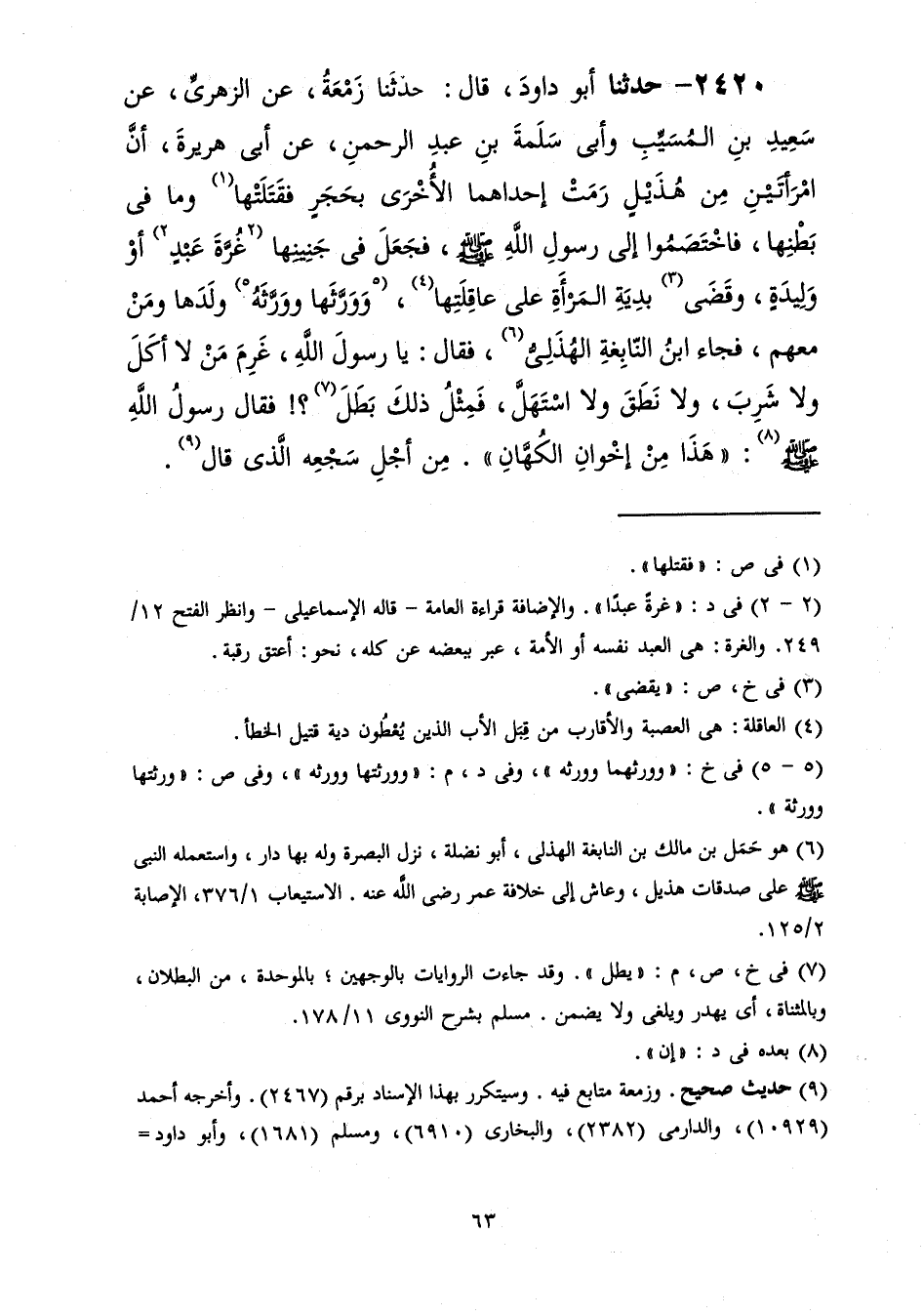 2418 - حَدَّثَنَا أَبُو دَاوُدَ قَالَ: حَدَّثَنَا زَمْعَةُ، عَنِ الزُّهْرِيِّ، عَنْ سَعِيدٍ، عَنْ أَبِي هُرَيْرَةَ، قَالَ: قَالَ رَسُولُ اللَّهِ صَلَّى اللهُ عَلَيْهِ وَسَلَّمَ: «§لَا فَرَعَ وَلَا عَتِيرَةَ» قَالَ سَعِيدٌ: فَالْفَرَعُ أَوَّلُ نِتَاجٍ يُنْتَجُ كَانُوا يَذْبَحُونَهُ لِطَوَاغِيتِهِمْ، نَهَاهُمْ رَسُولُ اللَّهِ صَلَّى اللهُ عَلَيْهِ وَسَلَّمَ عَنْهَا، وَالْعَتِيرَةُ ذَبِيحَةُ مُضَرَ فِي رَجَبٍ، فَنَهَاهُمْ رَسُولُ اللَّهِ صَلَّى اللهُ عَلَيْهِ وَسَلَّمَ عَنْهَا