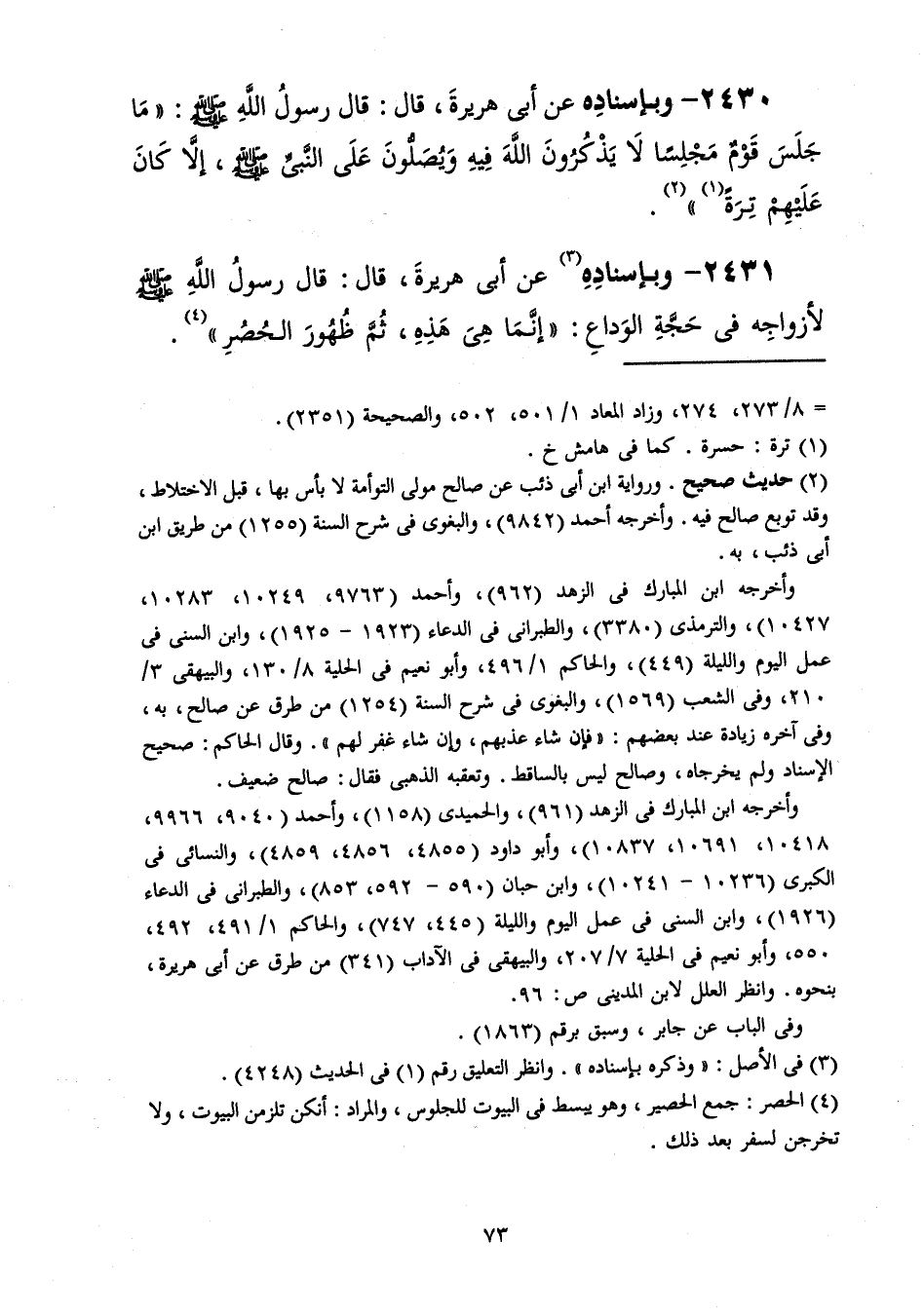 2430- وَبِإِسْنَادِهِ عَنْ أَبِي هُرَيْرَةَ، قَالَ: قَالَ رَسُولُ اللهِ صَلَّى الله عَلَيْهِ وَسَلَّمَ: مَا جَلَسَ قَوْمٌ مَجْلِسًا لاَ يَذْكُرُونَ اللَّهَ فِيهِ وَيُصَلُّونَ عَلَى النَّبِيِّ صَلَّى الله عَلَيْهِ وَسَلَّمَ إِلاَّ كَانَ عَلَيْهِمْ تِرَةً.