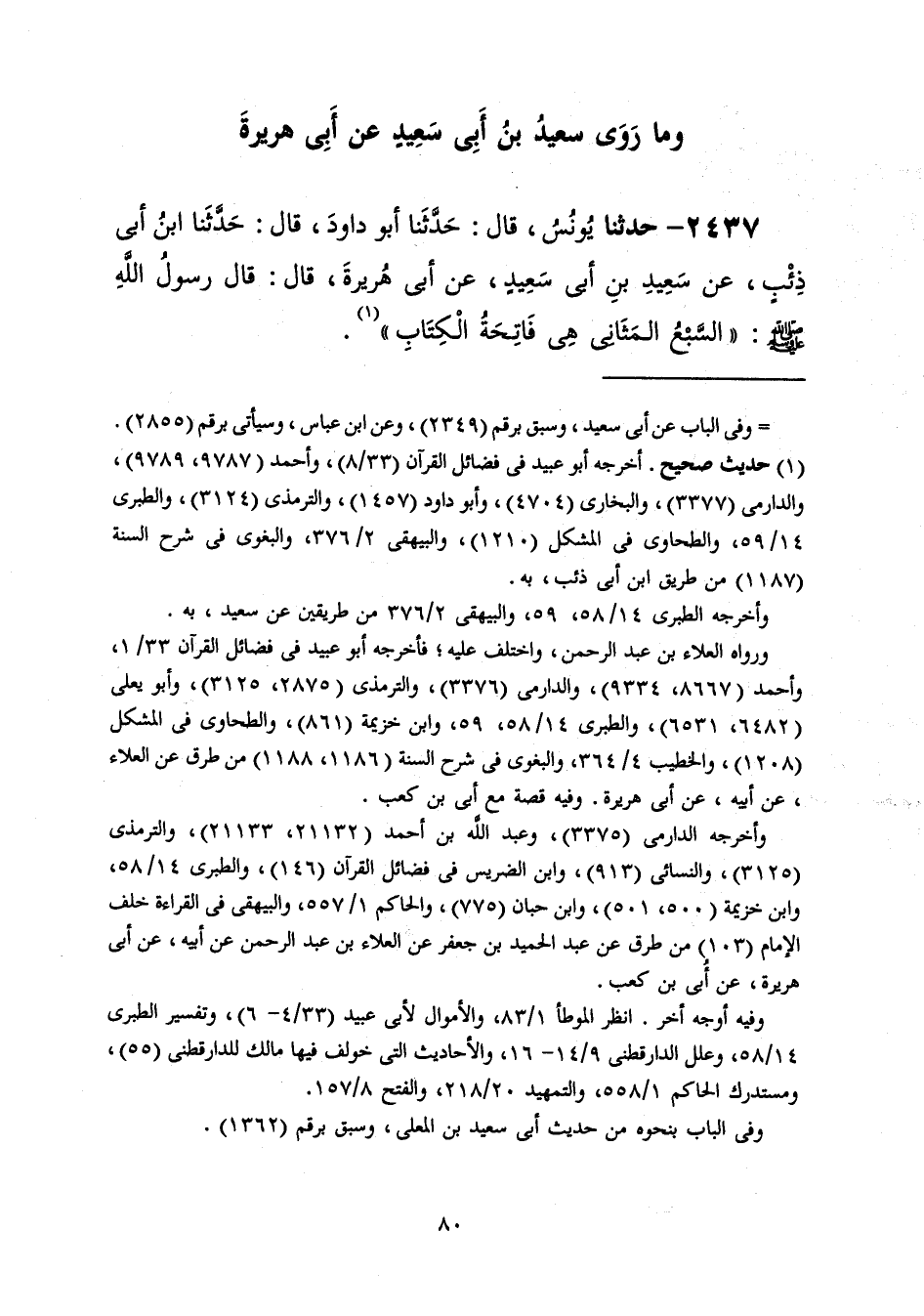 2437 - حَدَّثَنَا يُونُسُ قَالَ: حَدَّثَنَا أَبُو دَاوُدَ قَالَ: حَدَّثَنَا ابْنُ أَبِي ذِئْبٍ، عَنْ سَعِيدِ بْنِ أَبِي سَعِيدٍ، عَنْ أَبِي هُرَيْرَةَ، قَالَ: قَالَ رَسُولُ اللَّهِ صَلَّى اللهُ عَلَيْهِ وَسَلَّمَ: «§السَّبْعُ الْمَثَانِي هِيَ فَاتِحَةُ الْكِتَابِ»