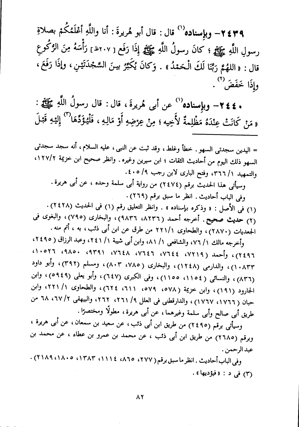 2438 - وَبِإِسْنَادِهِ عَنْ أَبِي هُرَيْرَةَ، أَنَّ رَسُولَ اللَّهِ صَلَّى اللهُ عَلَيْهِ وَسَلَّمَ صَلَّى رَكْعَتَيْنِ ثُمَّ سَلَّمَ فَقِيلَ: يَا رَسُولَ اللَّهِ، أَقُصِرَتِ الصَّلَاةُ أَمْ نَسِيتَ؟، فَقَالَ رَسُولُ اللَّهِ صَلَّى اللهُ عَلَيْهِ وَسَلَّمَ: «§لَمْ تُقْصَرِ وَلَمْ أَنَسَ» فَقَالَ الْقَوْمُ: بَلَى يَا رَسُولَ اللَّهِ، فَرَجَعَ رَسُولُ اللَّهِ صَلَّى اللهُ عَلَيْهِ وَسَلَّمَ فَصَلَّى رَكْعَتَيْنِ ثُمَّ سَجَدَ سَجْدَتَيْنِ