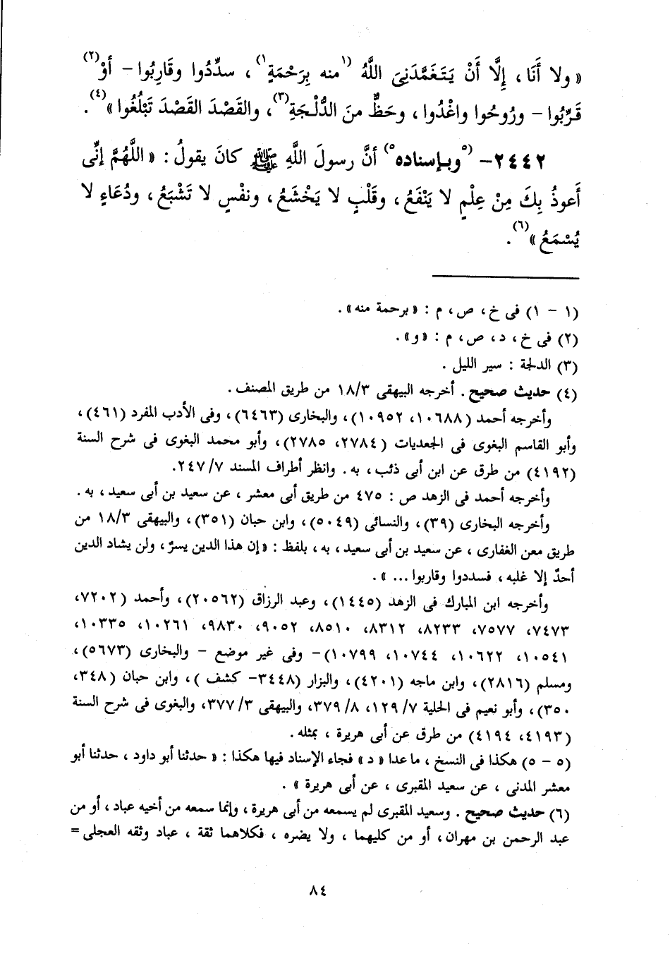 2441 - وَبِإِسْنَادِهِ عَنْ أَبِي هُرَيْرَةَ، قَالَ: قَالَ رَسُولُ اللَّهِ صَلَّى اللهُ عَلَيْهِ وَسَلَّمَ: «§مَا مِنْكُمْ أَحَدٌ يُنَجِّيهِ عَمَلُهُ» قَالُوا: وَلَا أَنْتَ يَا رَسُولَ اللَّهِ؟، قَالَ -[85]-: «وَلَا أَنَا، إِلَّا أَنْ يَتَغَمَّدَنِيَ اللَّهُ مِنْهُ بِرَحْمَةٍ، سَدِّدُوا وَقَارِبُوا، أَوْ قَرِّبُوا، وَرُوحُوا وَاغْدُوا، وَحَظٌّ مِنَ الدُّلْجَةِ، وَالْقَصْدَ الْقَصْدَ تَبْلُغُوا»
