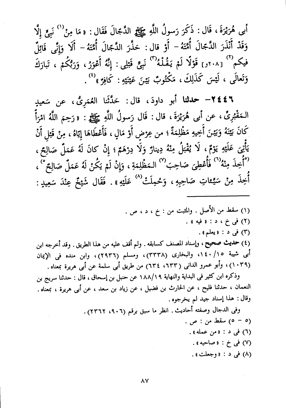2445 - حَدَّثَنَا أَبُو دَاوُدَ قَالَ: حَدَّثَنَا أَبُو مَعْشَرٍ، عَنْ سَعِيدٍ، عَنْ -[88]- أَبِي هُرَيْرَةَ، قَالَ: ذَكَرَ رَسُولُ اللَّهِ صَلَّى اللهُ عَلَيْهِ وَسَلَّمَ الدَّجَّالَ فَقَالَ: «§مَا مِنْ نَبِيٍّ إِلَّا وَقَدْ أَنْذَرَ الدَّجَّالَ أُمَّتَهُ» أَوْ قَالَ: " حَذَّرَ الدَّجَّالَ أُمَّتَهُ، أَلَا وَإِنِّي قَائِلٌ فِيكُمْ قَوْلًا لَمْ يَقُلْهُ نَبِيٌّ قَبْلِي: إِنَّهُ أَعْوَرُ، وَرَبُّكُمْ تَبَارَكَ وَتَعَالَى لَيْسَ كَذَلِكَ، مَكْتُوبٌ بَيْنَ عَيْنَيْهِ: كَافِرٌ "