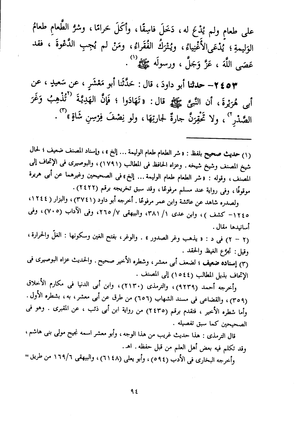 2452 - حَدَّثَنَا أَبُو دَاوُدَ قَالَ: حَدَّثَنَا الْيَمَانُ أَبُو حُذَيْفَةَ، عَنْ طَلْحَةَ بْنِ أَبِي عُثْمَانَ عَنْ سَعِيدٍ الْمَقْبُرِيِّ، عَنْ أَبِي هُرَيْرَةَ، قَالَ: «§مَنْ دَخَلَ -[95]- عَلَى طَعَامٍ وَلَمْ يُدْعَ لَهُ دَخَلَ فَاسِقًا وَأَكَلَ حَرَامًا، وَشَرُّ الطَّعَامِ طَعَامُ الْوَلِيمَةِ، يُدْعَى الْأَغْنِيَاءُ وَيُتْرَكُ الْفُقَرَاءُ، وَمَنْ لَمْ يُجِبِ الدَّعْوَةَ فَقَدْ عَصَى اللَّهَ عَزَّ وَجَلَّ وَرَسُولَهُ صَلَّى اللهُ عَلَيْهِ وَسَلَّمَ»