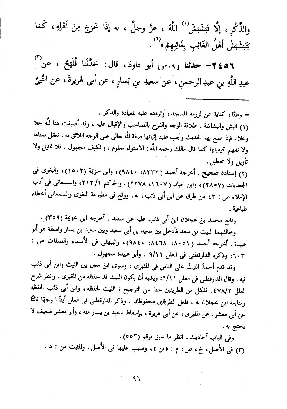 2455 - حَدَّثَنَا يُونُسُ قَالَ: حَدَّثَنَا أَبُو دَاوُدَ قَالَ: حَدَّثَنَا ابْنُ أَبِي ذِئْبٍ، عَنْ سَعِيدِ بْنِ أَبِي سَعِيدٍ الْمَقْبُرِيِّ، عَنْ سَعِيدِ بْنِ يَسَارٍ، عَنْ أَبِي هُرَيْرَةَ، قَالَ: قَالَ رَسُولُ اللَّهِ صَلَّى اللهُ عَلَيْهِ وَسَلَّمَ: «§لَا يُوَطِّنُ عَبْدٌ الْمَسْجِدَ لِلصَّلَاةِ -[97]- وَالذِّكْرِ إِلَّا تَبَشْبَشَ اللَّهُ عَزَّ وَجَلَّ بِهِ إِذَا خَرَجَ مِنْ أَهْلِهِ كَمَا يَتَبَشْبَشُ أَهْلُ الْغَائِبِ بِغَائِبِهِمْ»