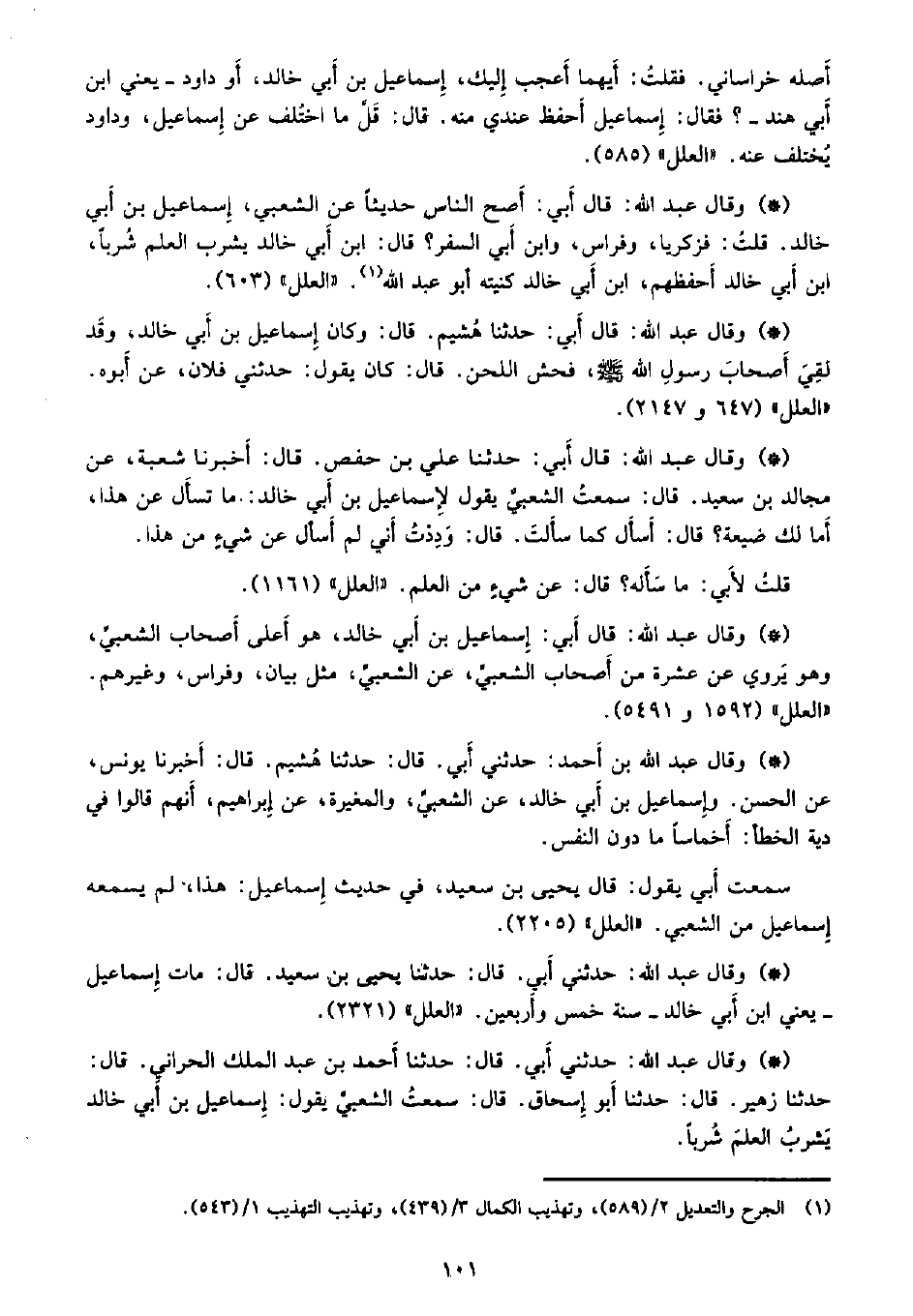• وقال عبد الله: قال أبي: إسماعيل بن أبي خالد، هو أعلى أصحاب الشعبي. وهو يروي عن عشرة من أصحاب الشعبي، عن الشعبي، مثل بيان، وفراس، وغيرهم. «العلل» (1592 و5491) .