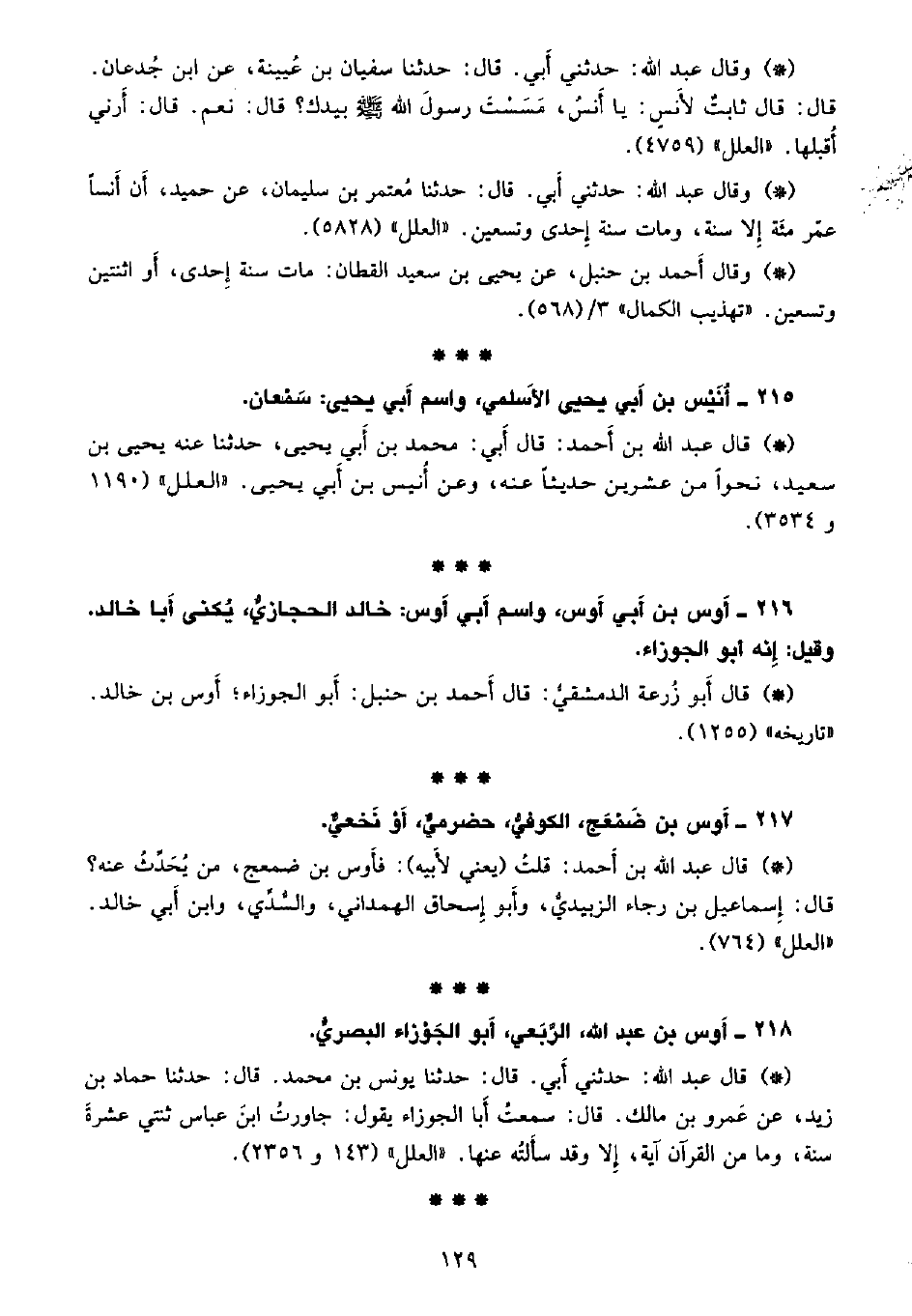 • وقال عبد الله: حدثني أبي. قال: حدثنا سفيان بن عيينة، عن ابن جدعان. قال: قال ثابت لأنس: يا أنس، مسست رسول الله - صلى الله عليه وسلم - بيدك؟ قال: نعم. قال: أرني أُقبلها. «العلل» (4759) .