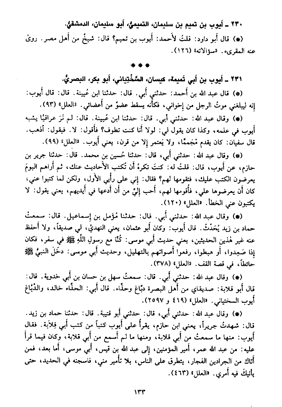• وقال عبد الله: حدثني أبي، قال: حدثني أبو قتيبة. قال: حدثنا حماد بن زيد. قال: شهدت جريرًا، يعني ابن حازم، يقرأ على أيوب كتبًا من كتب أبي قلابة. فقال أيوب: منها ما سمعت من أبي قلابة، ومنها ما لم أسمع من أبي قلابه، وكان فيما قرأ عليه: من عبد الله عمر، أمير المؤمنين، إلى عبد لله بن قيس، أبي موسى، أما بعد، فمن أتاك من الجرادين الفجار، يتطرق على الناس، بلا تأمير مني، فاسجنه في الحديد، حتى يأتيك فيه أمري. «العلل» (463) .