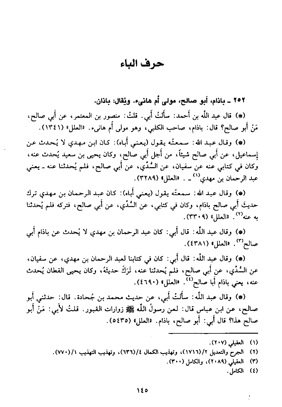 • وقال عبد الله: سألت أبي، عن حديث محمد بن جحادة. قال حدثني أبو صالح، عن ابن عباس قال: لعن رسول الله - صلى الله عليه وسلم - زوارات القبور. قلت لأبي: من أبو صالح هذا؟ قال أبي: أبو صالح، باذام. «العلل» (5435) .