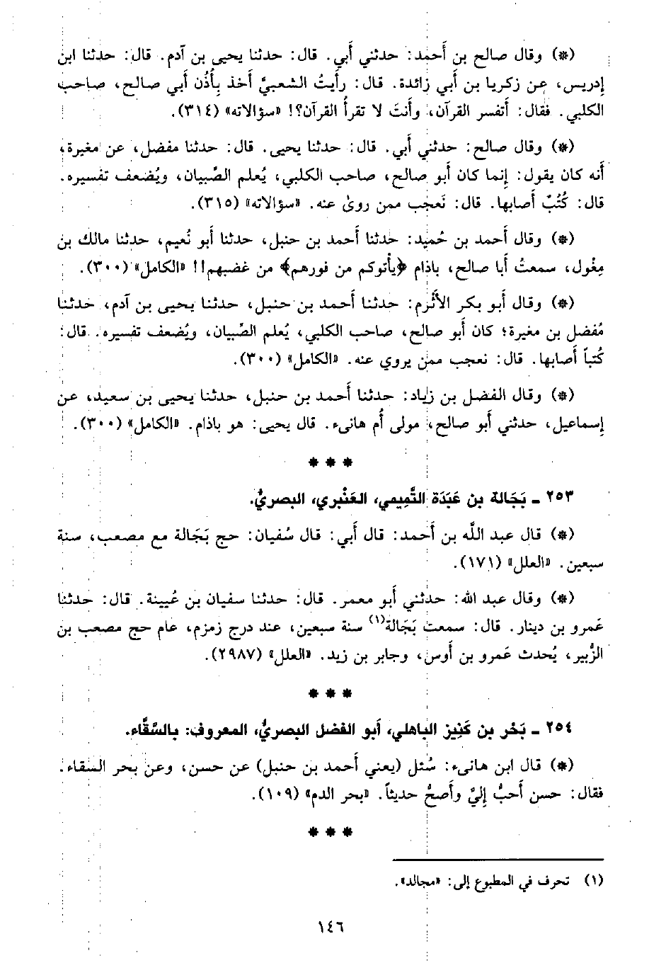 • وقال أبو بكر الأثرم: حدثنا أحمد بن حنبل، حدثنا يحيى بن آدم، حدثنا مفضل بن مغيره؛ كان أبو صالح، صاحب الكلبي، يعلم الصبيان، ويضعف تفسيره. قال: كُتب أصابها. قال: نعجب ممن يروى عنه. «الكامل» (300) .