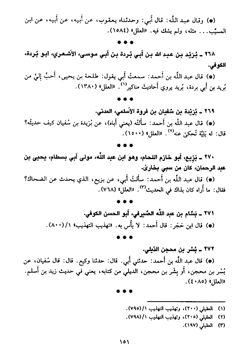 • قال عبد الله بن أحمد: سمعتُ أَبي يقول: طلحة بن يحيى، أحب إلي من بريد بن أبي بردة، بريد يروي أحاديث مناكير. «العلل» (1380) .