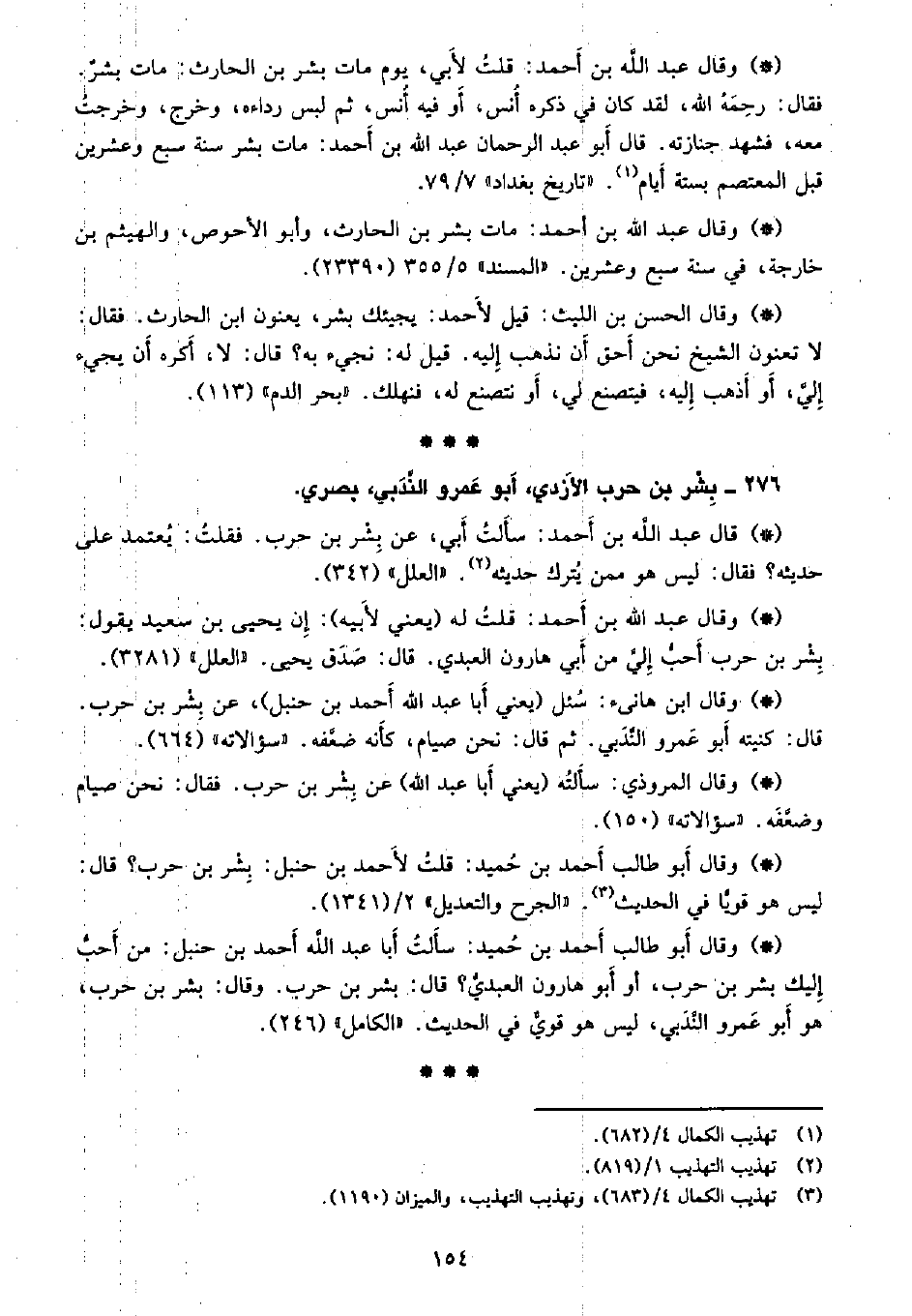 • وقال ابن هانىء: سُئل (يعني أبا عبد الله أحمد بن حنبل) ، عن بشر بن حرب. قال: كنيته أبو عمرو الندبي. ثم قال: نحن صيام، كأنه ضعفه. «سؤالاته» (664) .