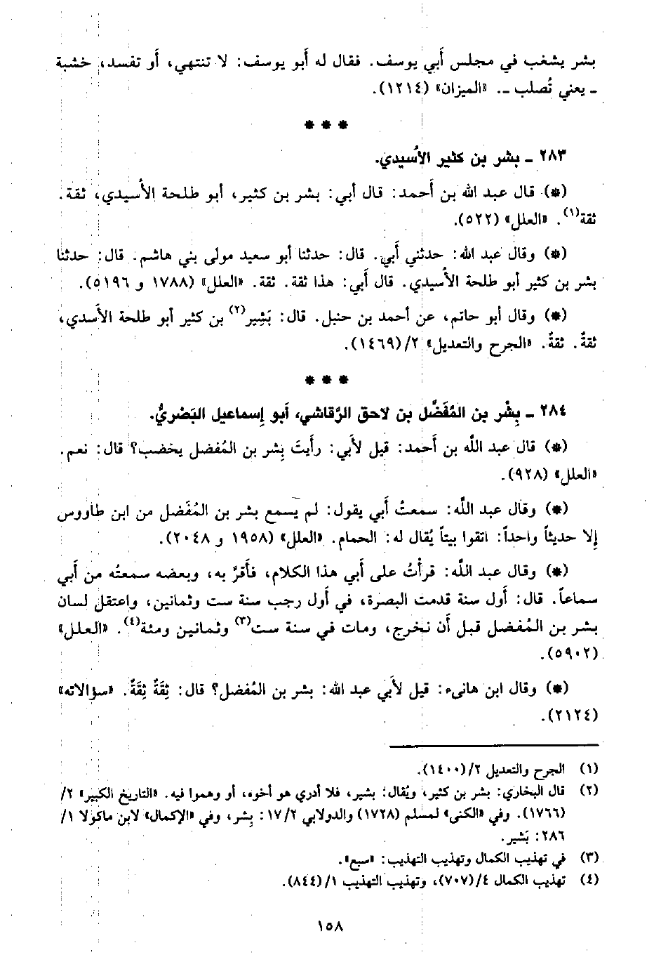 • وقال عبد الله: حدثني أبي. قال: حدثنا أبو سعيد مولى بني هاشم. قال: حدثنا بشر بن كثير أبو طلحة الأسيدي. قال أبي: هذا ثقة. ثقة. «العلل» (1788 و5196) .