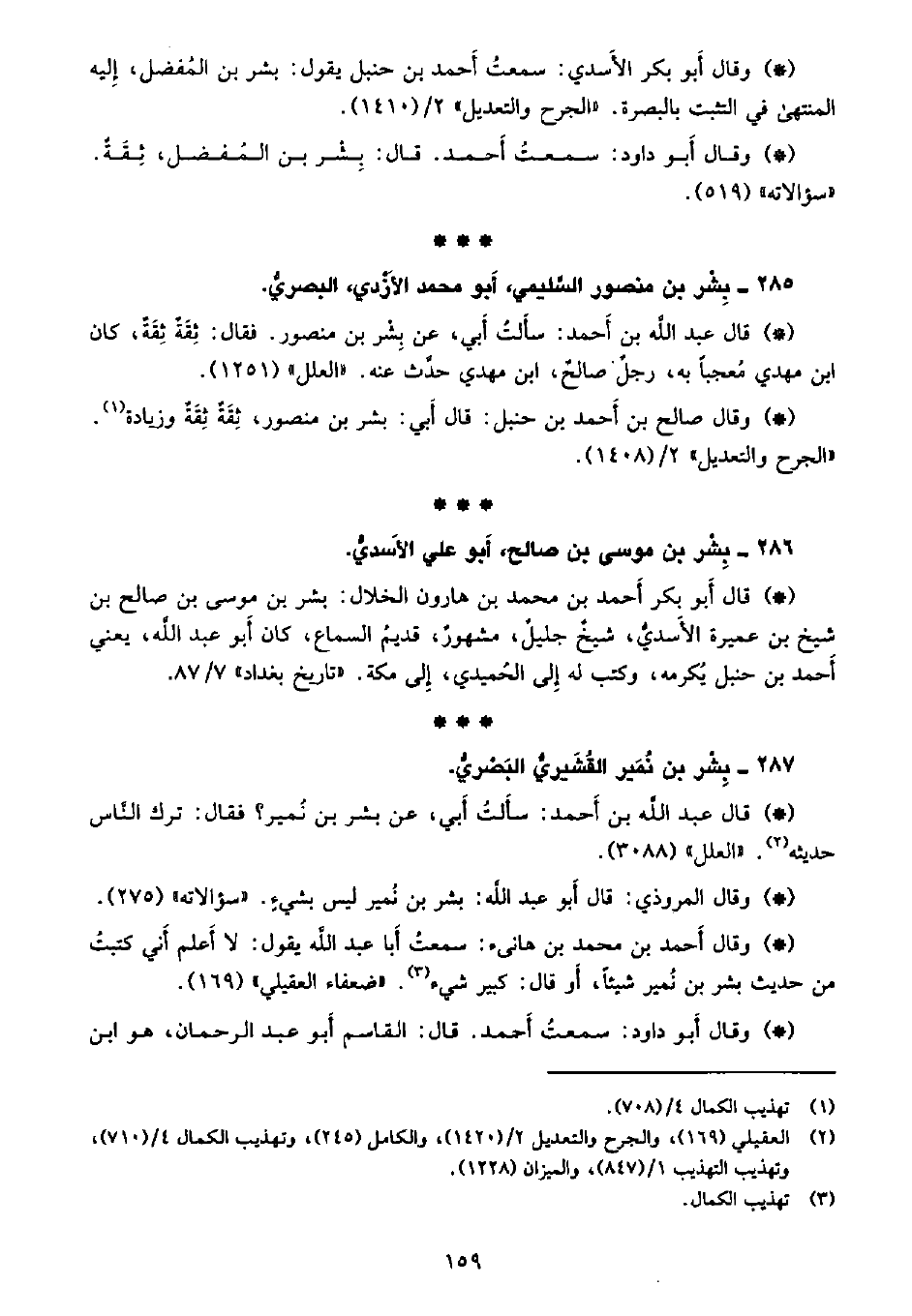 • وقال أبو بكر الأسدي: سمعت أحمد بن حنبل يقول: بشر بن المفضل، إليه المنتهى في التثبت بالبصرة. «الجرح والعتديل» 2/ (1410) .