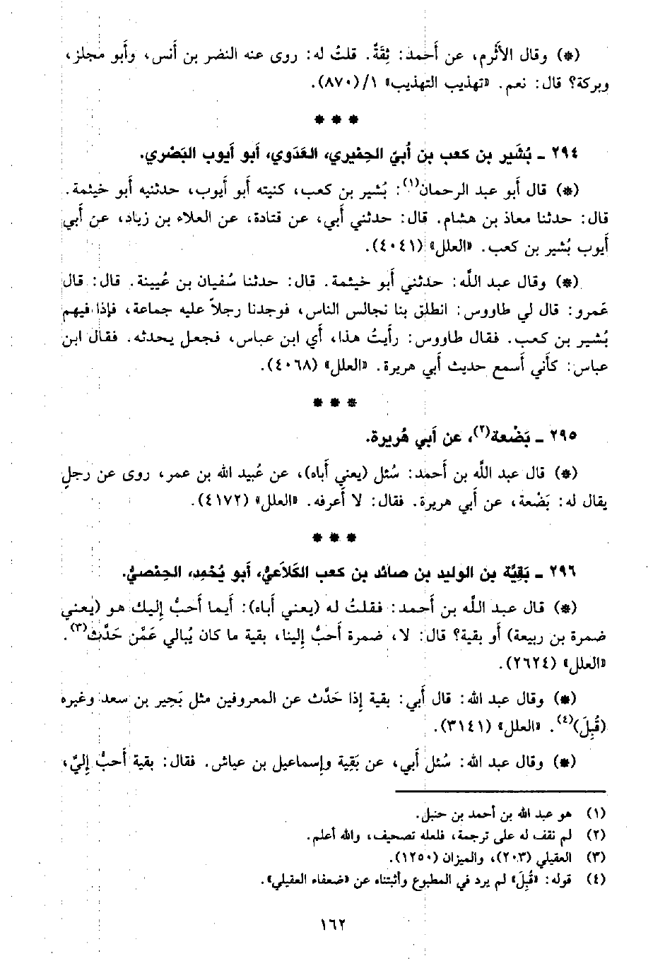 • قال عبد الله بن أحمد: سُئل (يعني أباه) ، عن عبيد الله بن عمر، روى عن رجل يقال له: بضعة، عن أبي هريرة. فقال: لا أعرفه. «العلل» (4172) .