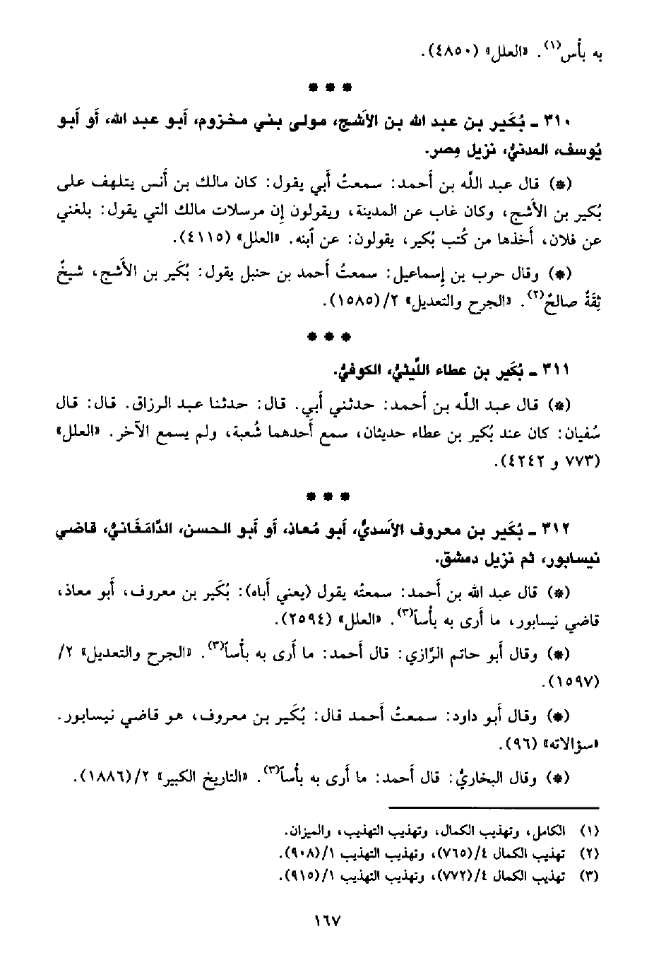 • وقال حرب بن إسماعيل: سمعت أحمد بن حنبل يقول: بكير بن الأشج، شيخ ثقة صالح. «الجرح والتعديل» 2/ (1585) .