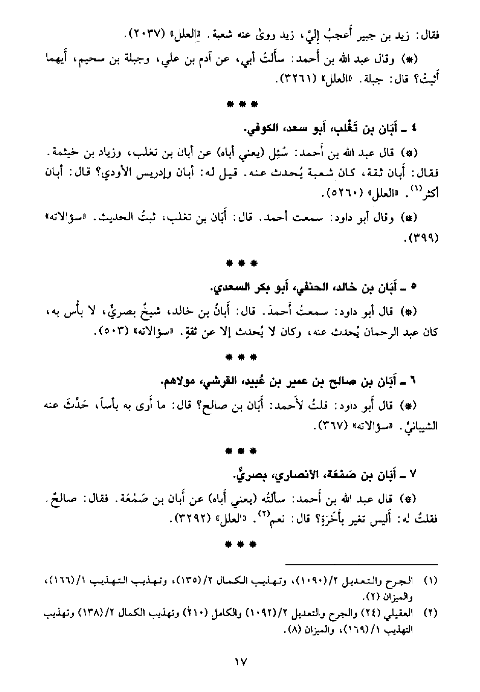 • قال عبد الله بن أحمد: سئل (يعني أباه) عن أبان بن تغلب، وزياد بن خيثمة. فقال: أبان ثقة، كان شعبة يحدث عنه. قيل له: أبان وإدريس الأودي؟ قال: أبان أكثر. «العلل» (5260) .