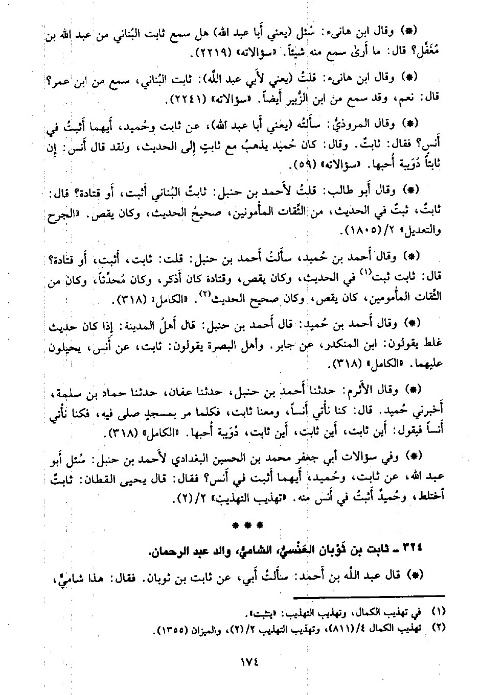 • وقال أبو طالب: قلت لأحمد بن حنبل: ثابت البناني أثبت، أو قتادة؟ قال: ثابت، ثبت في الحديث، من الثقات المأمونين، صحيح الحديث، وكان يقص. «الجرح والتعديل» 2/ (1805) .