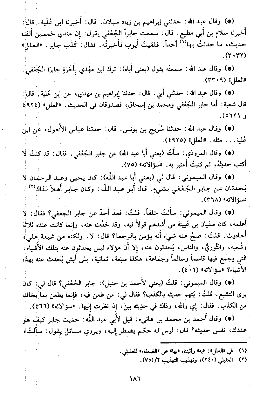 • وقال الميموني: سألت خلفًا. قلت قعد أحد عن جابر الجعفي؟ فقال لا أعلمه. كان سفيان بن عيينة من أشدهم قولاً فيه وقد حدث عنه، وإنما كانت عنده ثلاثة أحاديث. قلت: صح عنه شيء أنه يؤمن بالرجعة؟ قال: لا، ولكنه من شيعة علي، وشعبة، والثوري، والناس، يحدثون عنه، إلا أن هؤلاء ليس يحدثون عنه بتلك الأشياء، التي يجمع فيها قاسمًا وسالمًا وجماعة، هكذا سبعة، ثمانية، بلى أيش يحدث عنه بهذه الأشياء؟ «سؤلااته» (401) .