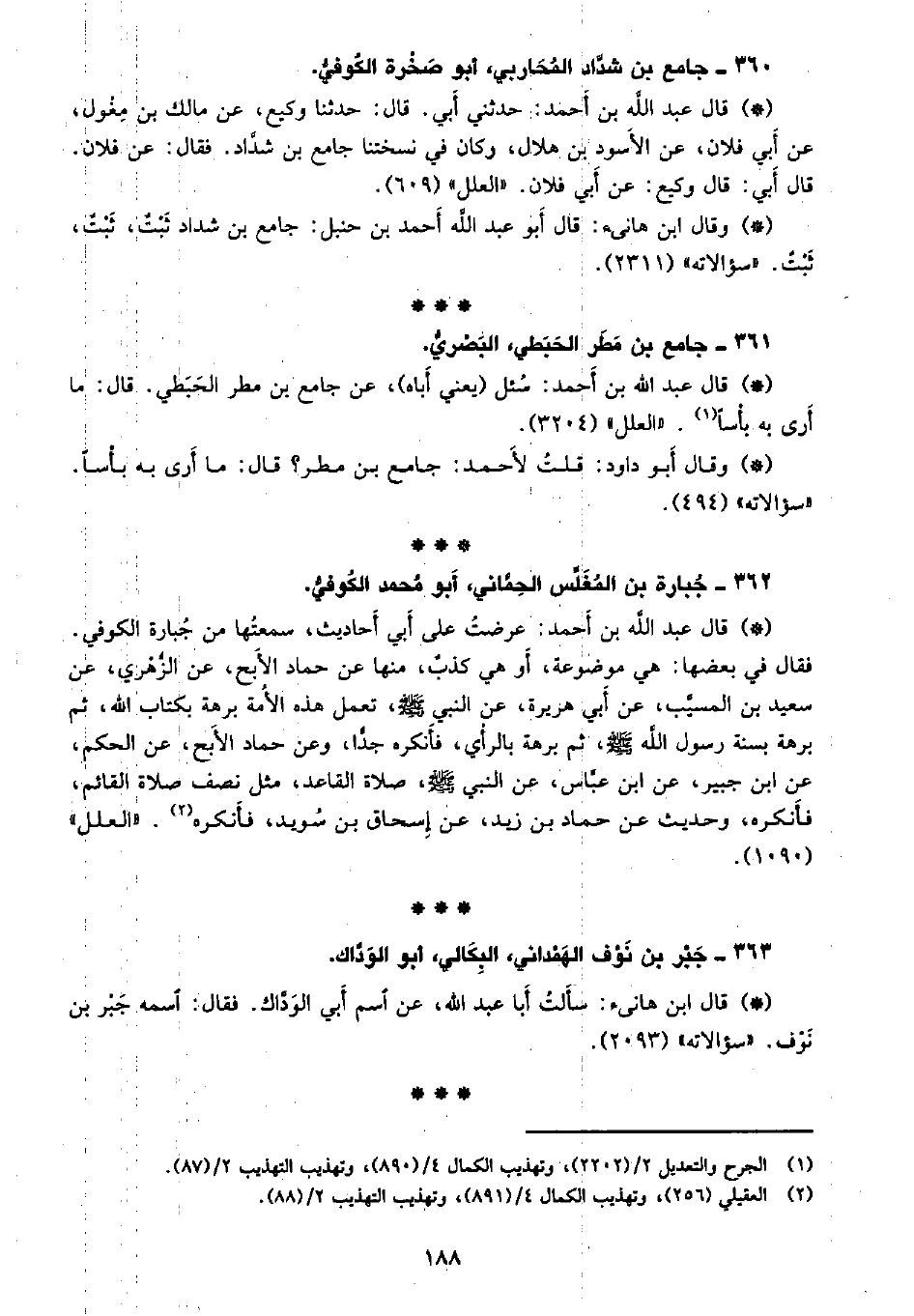 • قال ابن هانىء: سألت أبا عبد الله، عن اسم أبي الوداك. فقال: اسمه جبر بن نوف. «سؤالاته» (2093) .