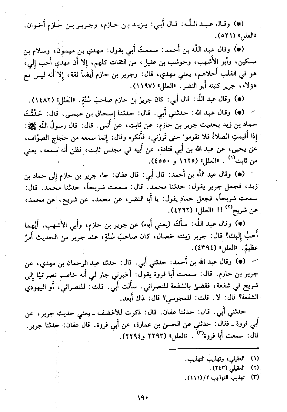 • وقال عبد الله: سألته (يعني أباه) عن جرير بن حازم، وأبي الأشهب، أيهما أحب إليك؟ قال: جرير زينته خصال، كان صاحب سنة، عند جرير من الحديث أمر عظيم. «العلل» (4394) .