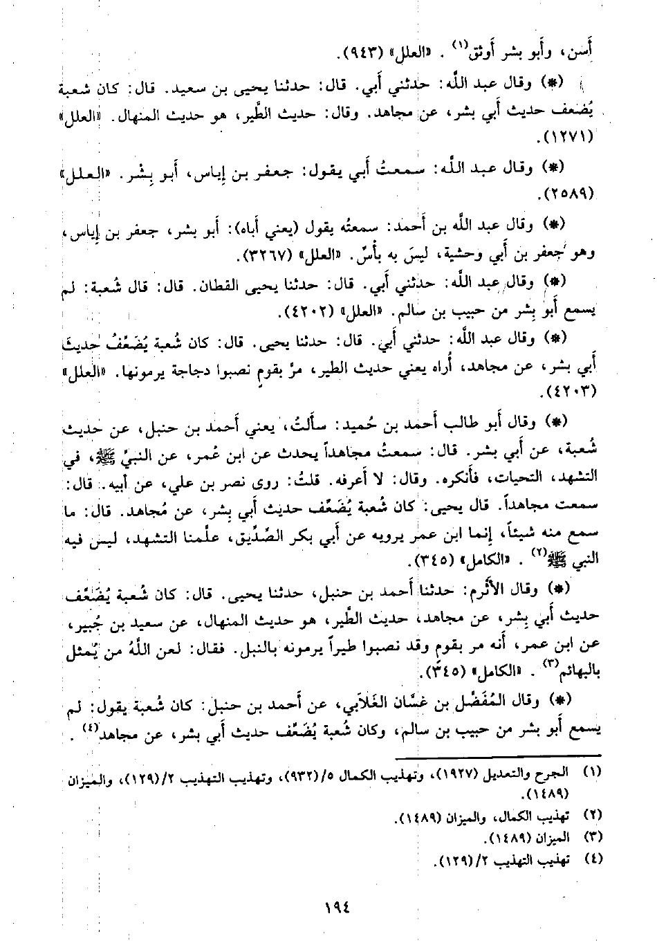 • وقال عبد الله: حدثني أبي. قال: حدثنا يحيى القطان. قال: قال شعبة: لم يسمع أبو بشر من حبيب بن سالم. «العلل» (4202) .