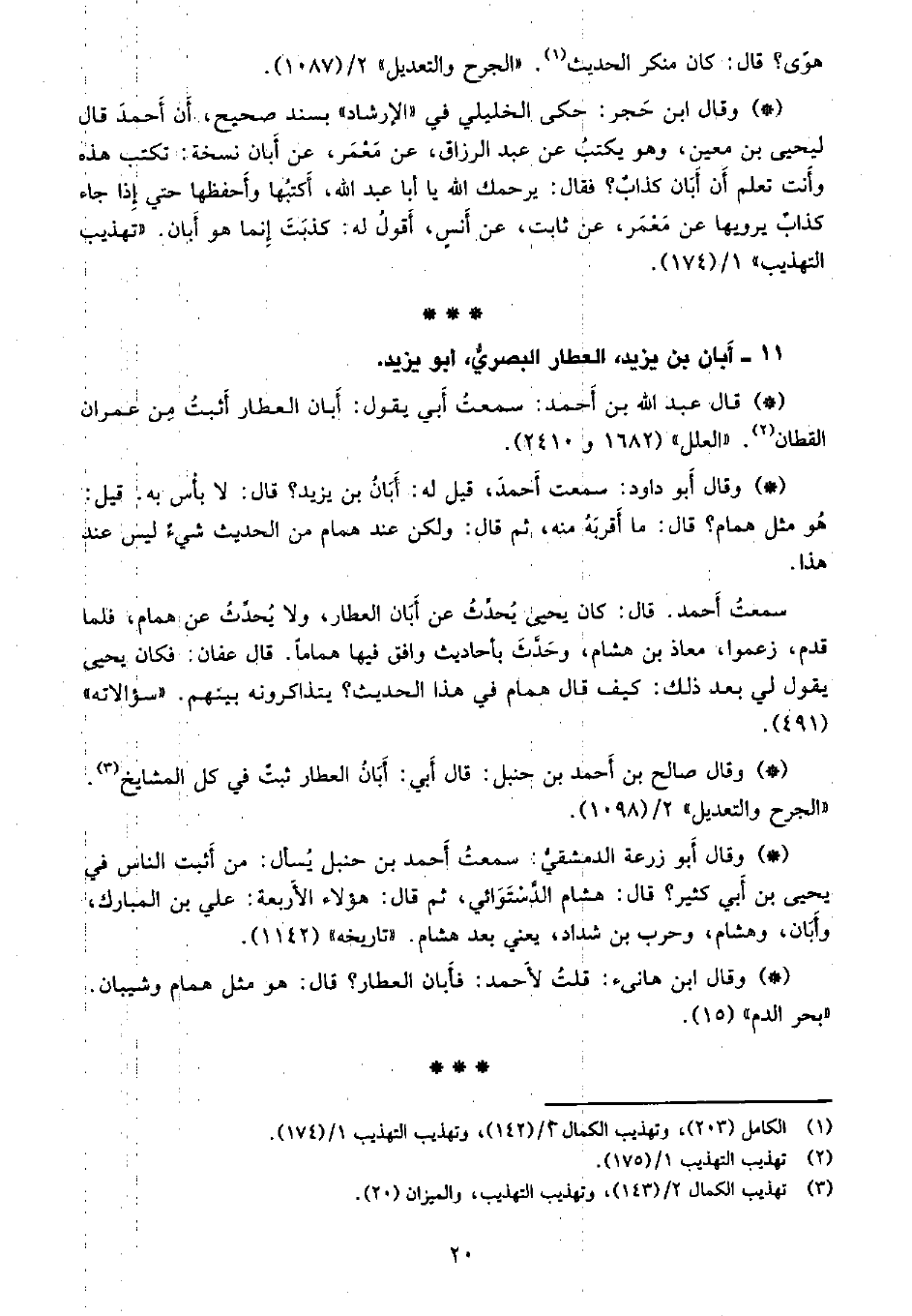• وقال ابن هانىء: قلت لأحمد: فأبان العطار؟ قال: هو مثل همام وشيبان. «بحر الدم» (15) .