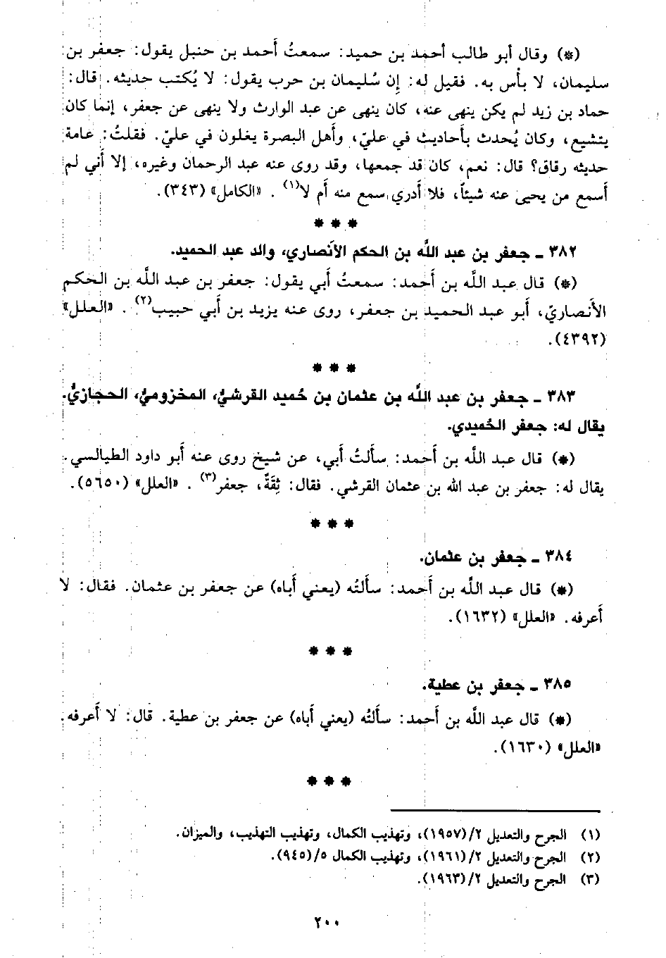 • قال عبد الله بن أحمد: سألته (يعني أباه) عن جعفر بن عثمان. فقال: لا أعرفه. «العلل» (1632) .