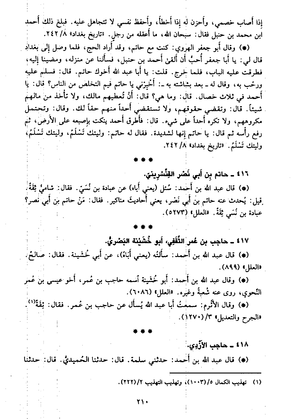 • وقال الأثرم: سمعت أبا عبد الله يسأل عن حاجب بن عمر. فقال: ثقة. «الجرح والتعديل» 3/ (1270) .