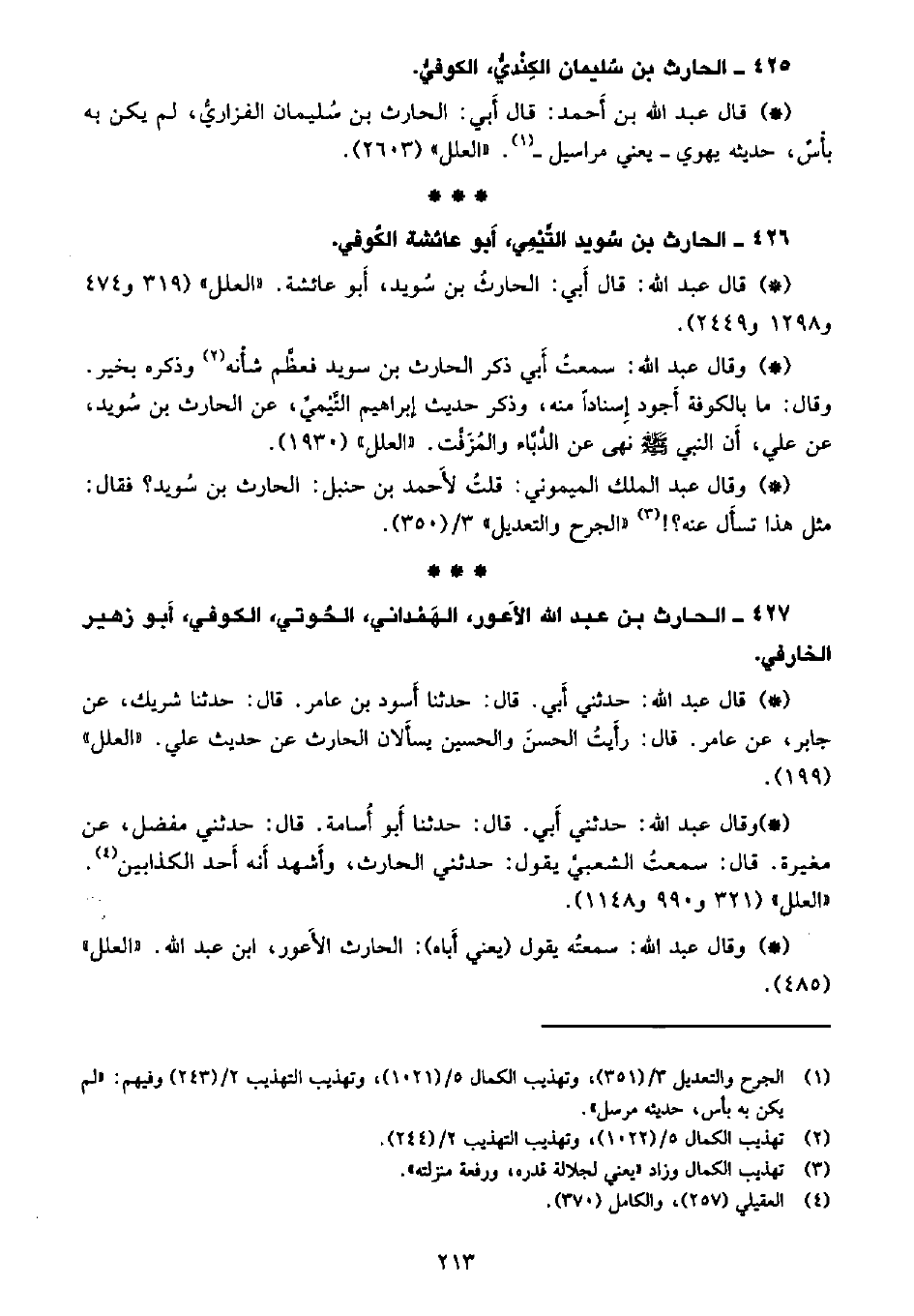 • وقال عبد الله: سَمِعتُهُ يقول (يعني أباه) : الحارث الأعور، ابن عبد الله. «العلل» (485) .