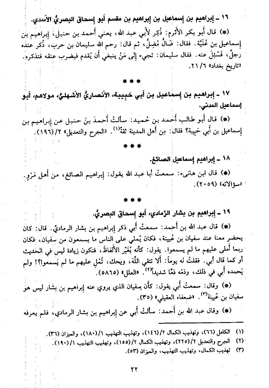• قال أبو بكر الأثرم: ذُكِر لأبي عبد الله يعني أحمد بن حنبل، إبراهيم بن إسماعيل بن علية. فقال: ضال مضل، ثم قال: رحم الله سليمان بن حرب، ذكر عنده رجل، فسئل عنه. فقال سليمان: تجيء إلى من ينبغي أن يقدم فيضرب عنقه فتذكره. «تاريخ بغداد» 6/21.