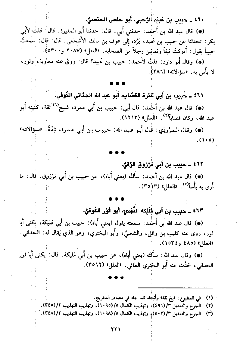 • وقال عبد الله: سألته (يعني أباه) ، عن حبيب بن أبي مليكة. قال: يكنى أبا ثور الحداني. حدث عنه أبو البختري الطائي. «العلل» (3512) .