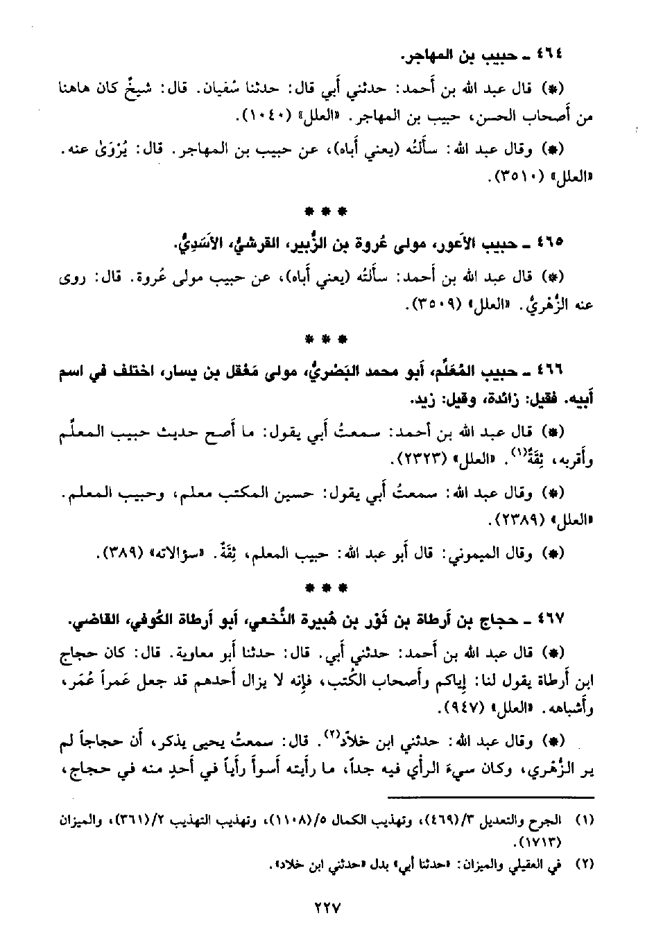 • وقال عبد الله: سألتُه (يعني أباه) ، عن حبيب بن المهاجر. قال: يروى عنه. «العلل» (3510) .