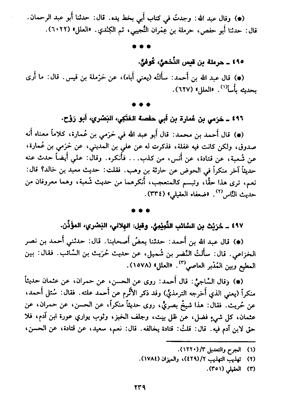 • وقال عبد الله: وجدت في كتاب أبي بخط يده. قال: حدثنا أبو عبد الرحمن. قال: حدثنا أبو حفص، حرملة بن عمران التجيبي، ثم الكندي. «العلل» (6022) .