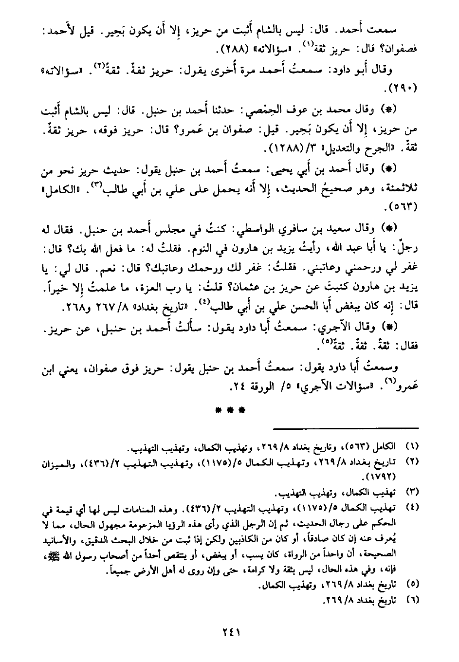 • وقال الآجري: سمعت أبا داود يقول: سآلت أحمد بن حنبل، عن حريز. فقال: ثقة. ثقة. ثقة.