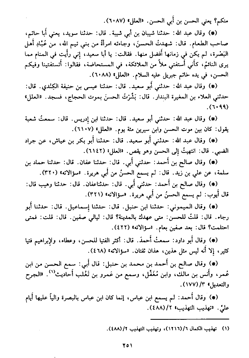 • وقال صالح بن أحمد بن محمد بن حنبل: قال أبي: سمع الحسن من ابن عمر، وأنس بن مالك، وابن مُغفل، وسمع من عمرو بن تغلب أحاديث. «الجرح والتعديل» 3/ (177) .