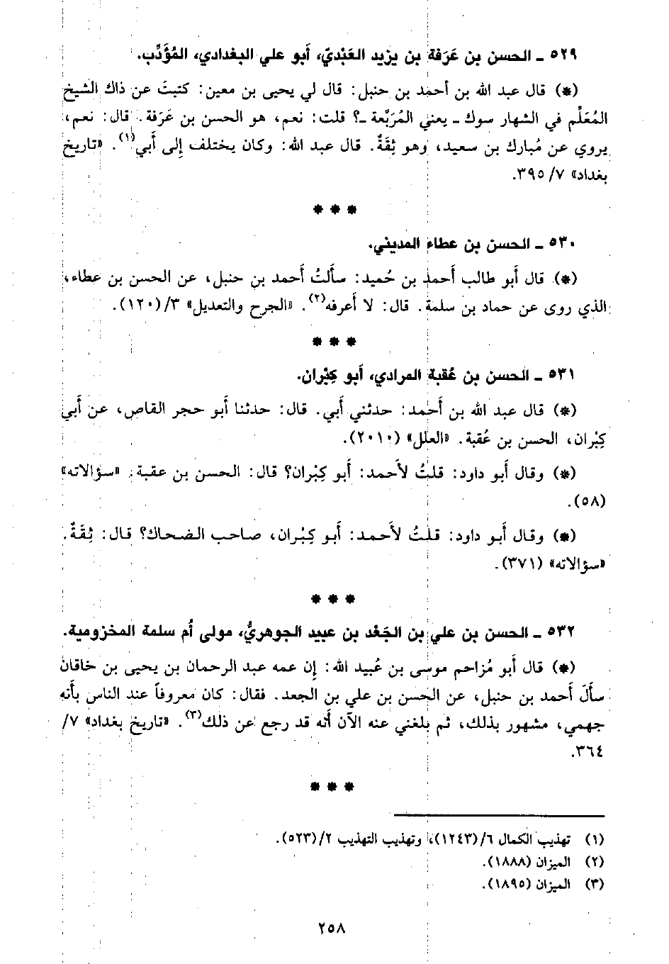 • قال عبد الله بن أحمد بن حنبل: قال لي يحيى بن معين: كتبت عن ذاك الشيخ المعلم في الشهار سوك - يعني المربعة -؟ قلت: نعم، هو الحسن بن عرفة. قال: نعم، يروي عن مبارك بن سعيد، وهو ثقة. قال عبد الله: وكان يختلف إلى أبي. «تاريخ بغداد» 7/395.