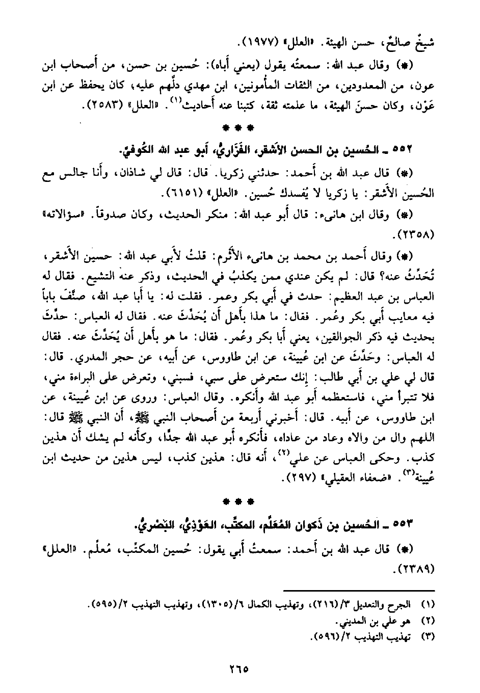 • قال عبد الله بن أحمد: حدثني زكريا. قال: قال لي شاذان وأنا جالس مع الحسين الأشقر: يا زكريا لا يفسدك حسين. «العلل» (6151) .